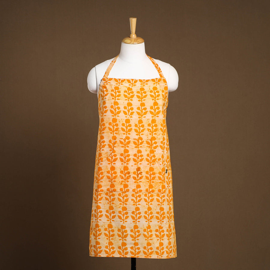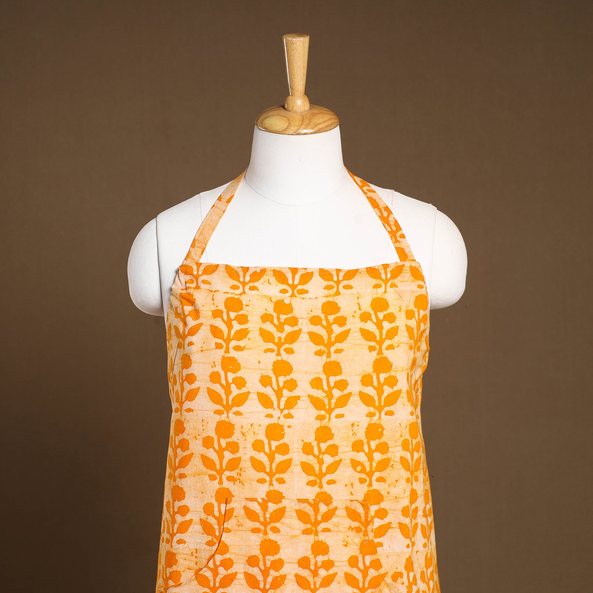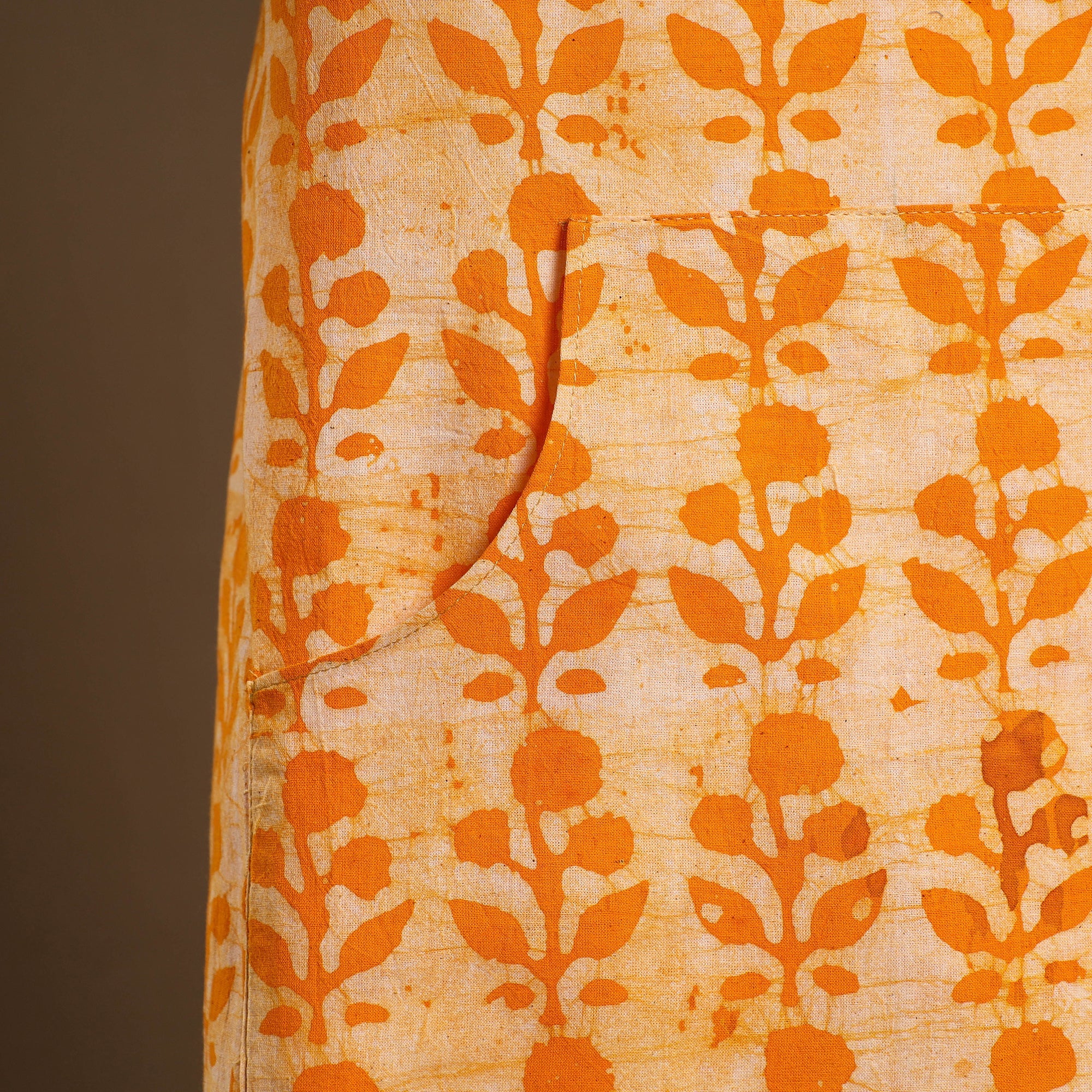 This orange batik print cotton apron with pocket, crafted with traditional block printing, combines cultural artistry with everyday functionality, it features a convenient front pocket and adjustable straps for a comfortable fit. Perfect for cooking, baking, or grilling, this apron adds style and convenience to your kitchen essentials.