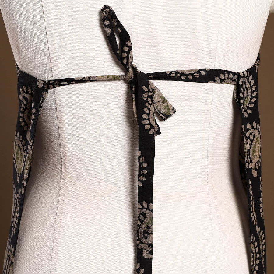 This black batik print cotton apron with pocket, crafted with traditional batik block printing, combines cultural artistry with everyday functionality. Adorned with batik prints, it features a convenient front pocket and adjustable straps for a comfortable fit. Perfect for cooking, baking, or grilling, this apron adds style and convenience to your kitchen essentials.