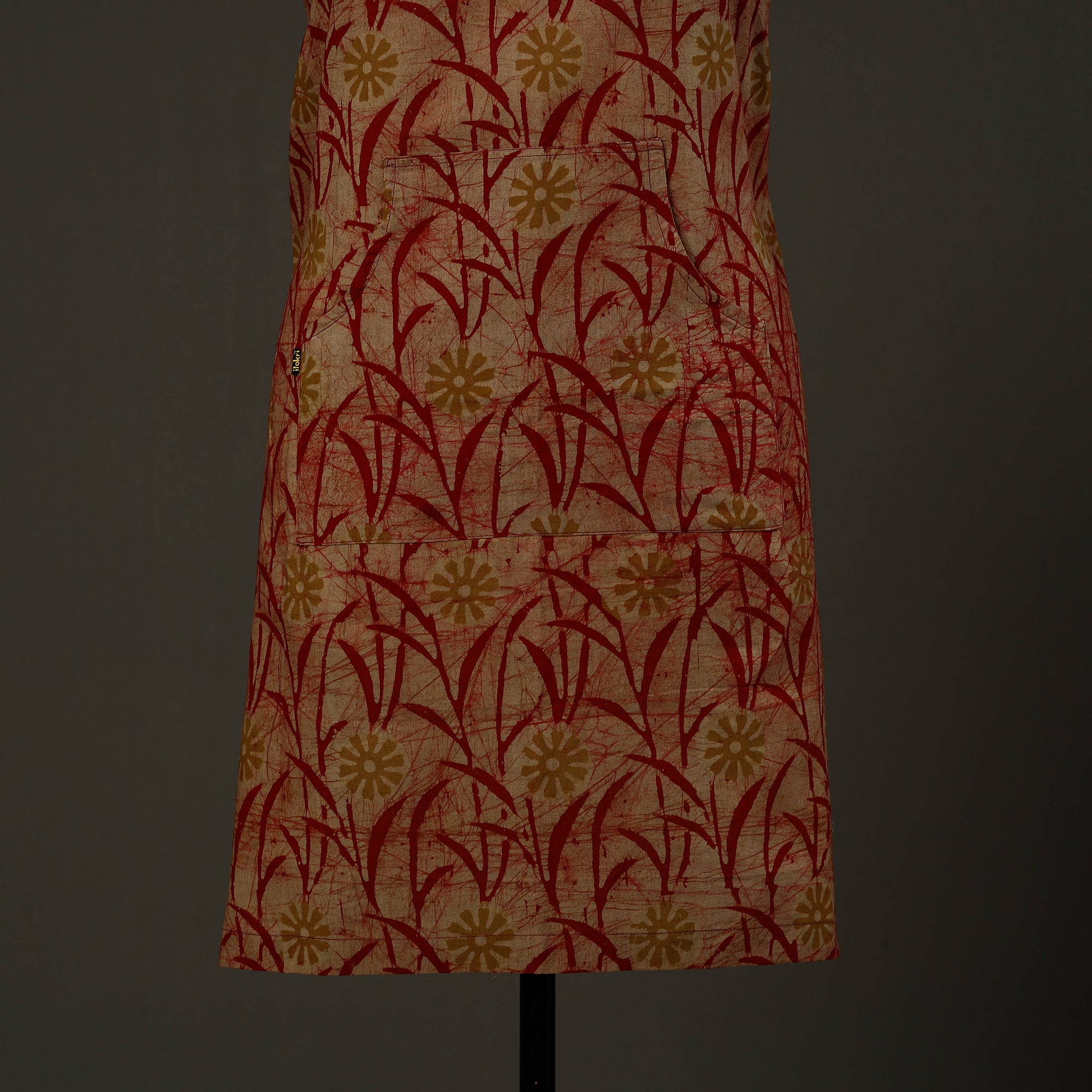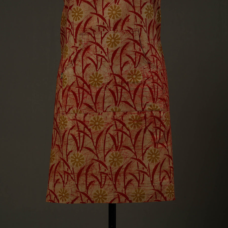 Upgrade your kitchen style with this red hand batik print cotton apron with pocket, crafted in Kutch using traditional wax-resist dyeing techniques. Made from soft, breathable cotton, it is lightweight. Designed to protect your clothing from splashes and spills, this handmade kitchen apron offers an adjustable neck strap and a front pocket for added convenience, making it ideal for daily cooking and baking.