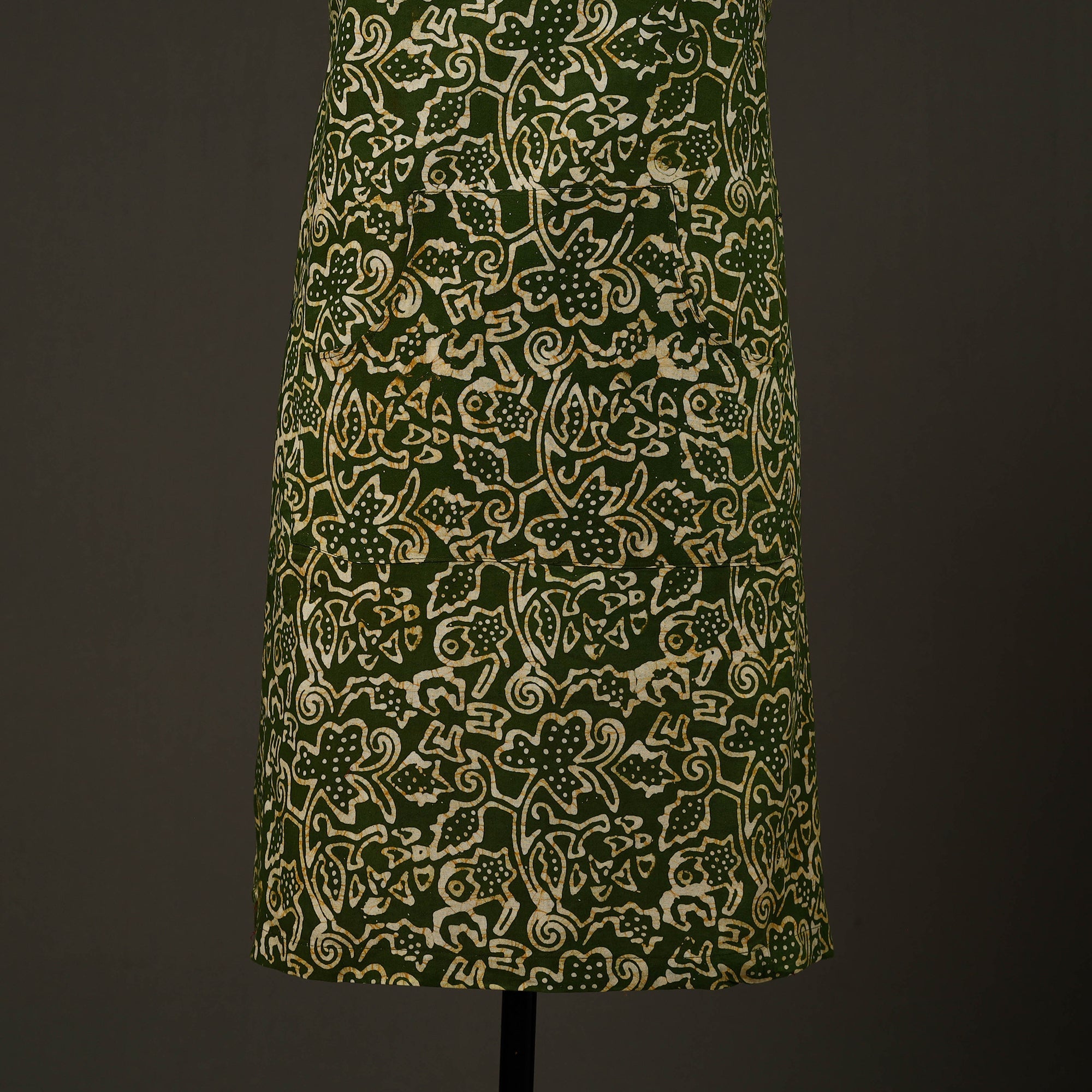 Upgrade your kitchen style with this green hand batik print cotton apron with pocket, crafted in Kutch using traditional wax-resist dyeing techniques. Made from soft, breathable cotton, it is lightweight. Designed to protect your clothing from splashes and spills, this handmade kitchen apron offers an adjustable neck strap and a front pocket for added convenience, making it ideal for daily cooking and baking.