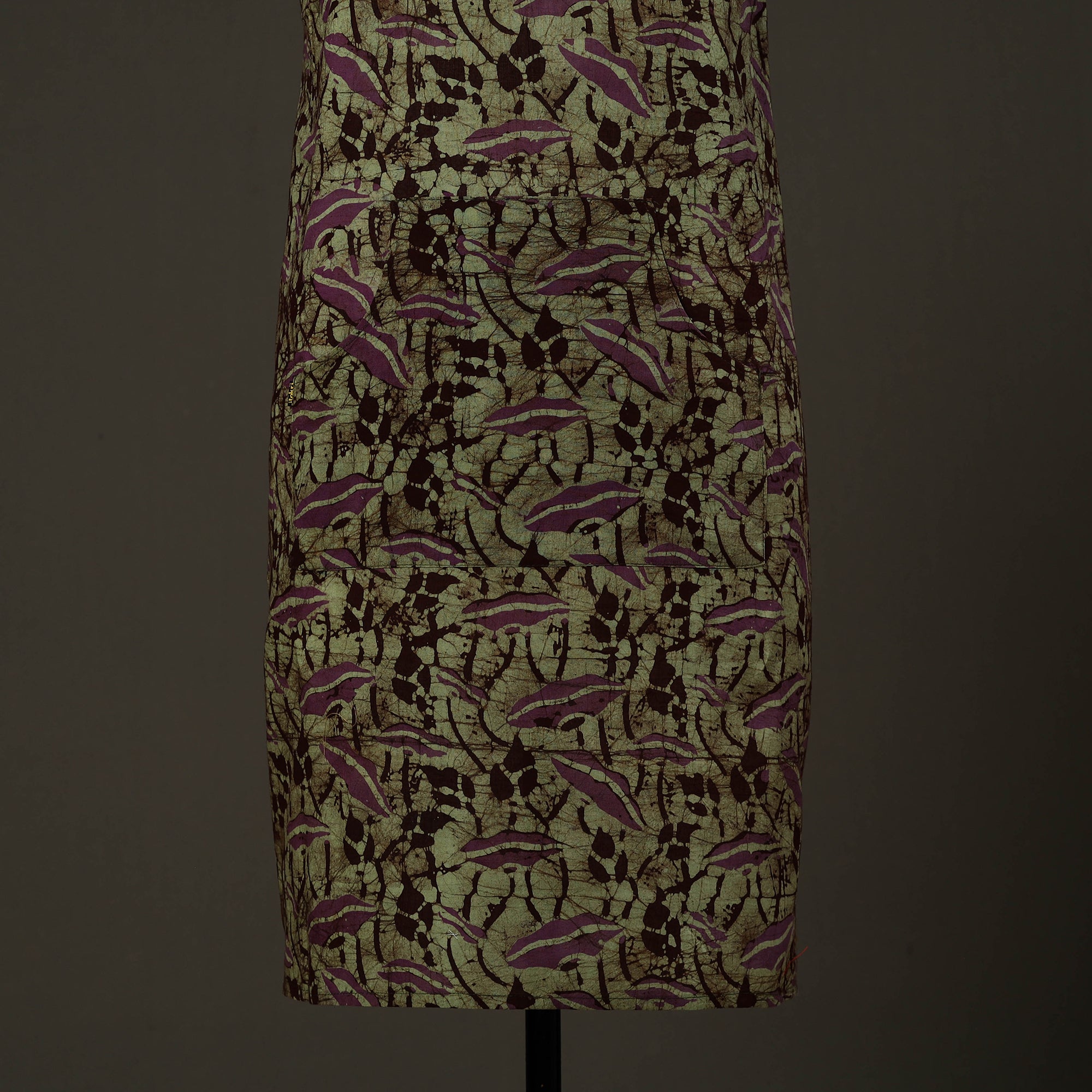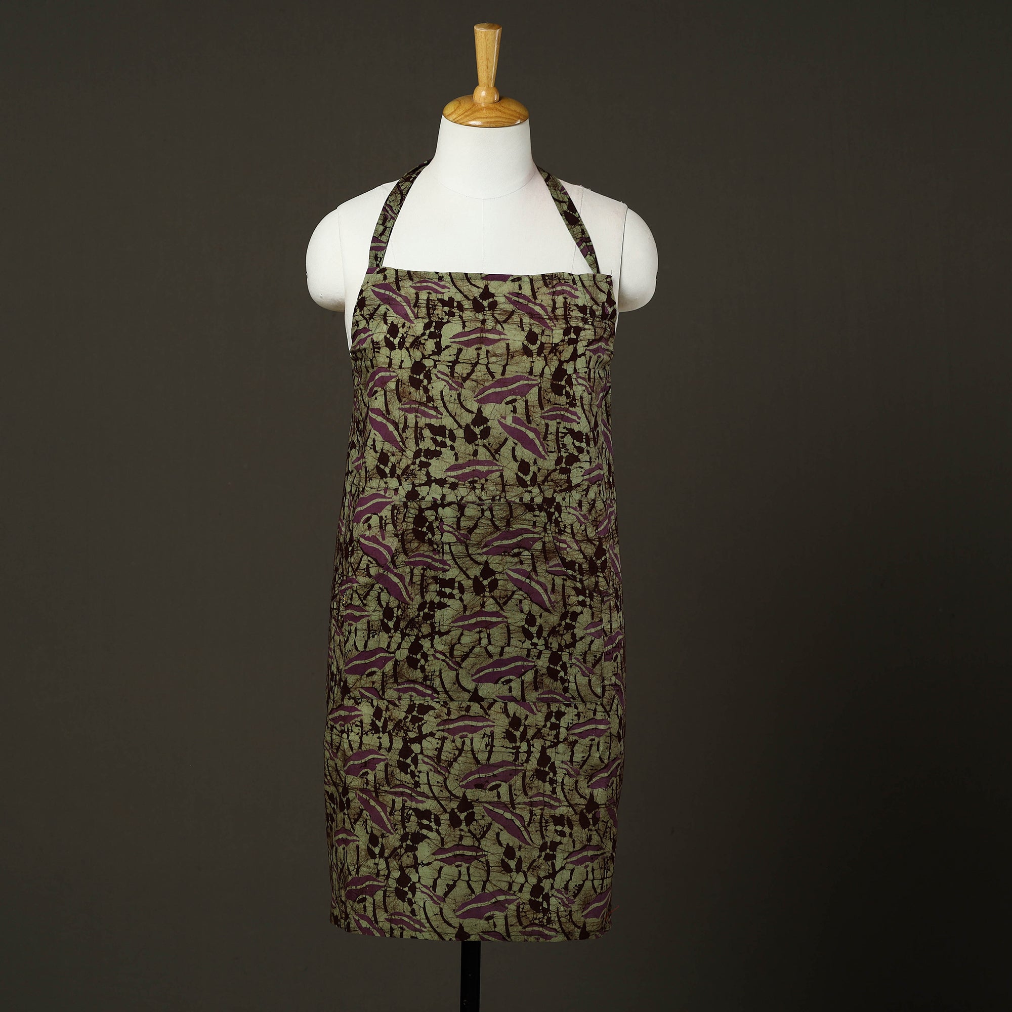 Upgrade your kitchen style with this green hand batik print cotton apron with pocket, crafted in Kutch using traditional wax-resist dyeing techniques. Made from soft, breathable cotton, it is lightweight. Designed to protect your clothing from splashes and spills, this handmade kitchen apron offers an adjustable neck strap and a front pocket for added convenience, making it ideal for daily cooking and baking.