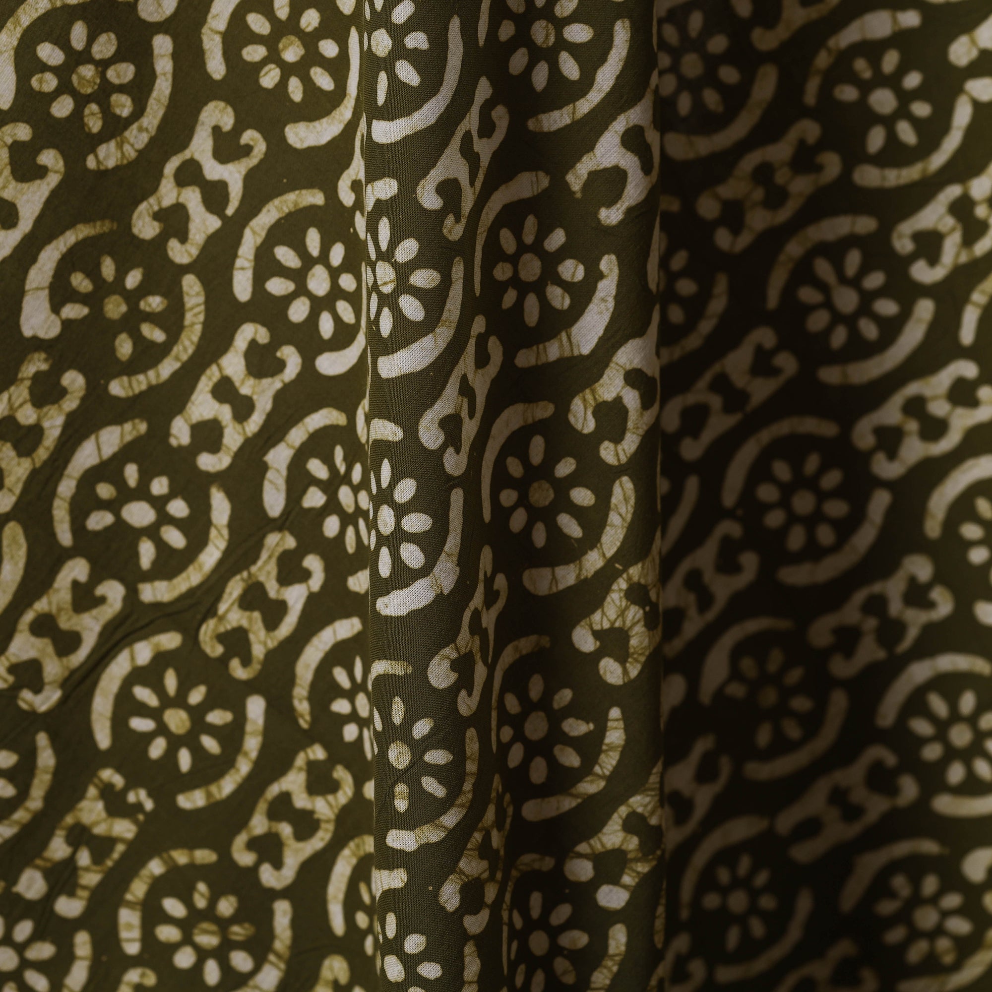 This green hand batik block-printed fabric is created using the centuries-old wax-resist dyeing technique, where molten wax is applied before dyeing to form intricate motifs. Crafted in breathable cotton, it blends durability with comfort, making it ideal for ethnic wear, casual outfits, or decor projects.