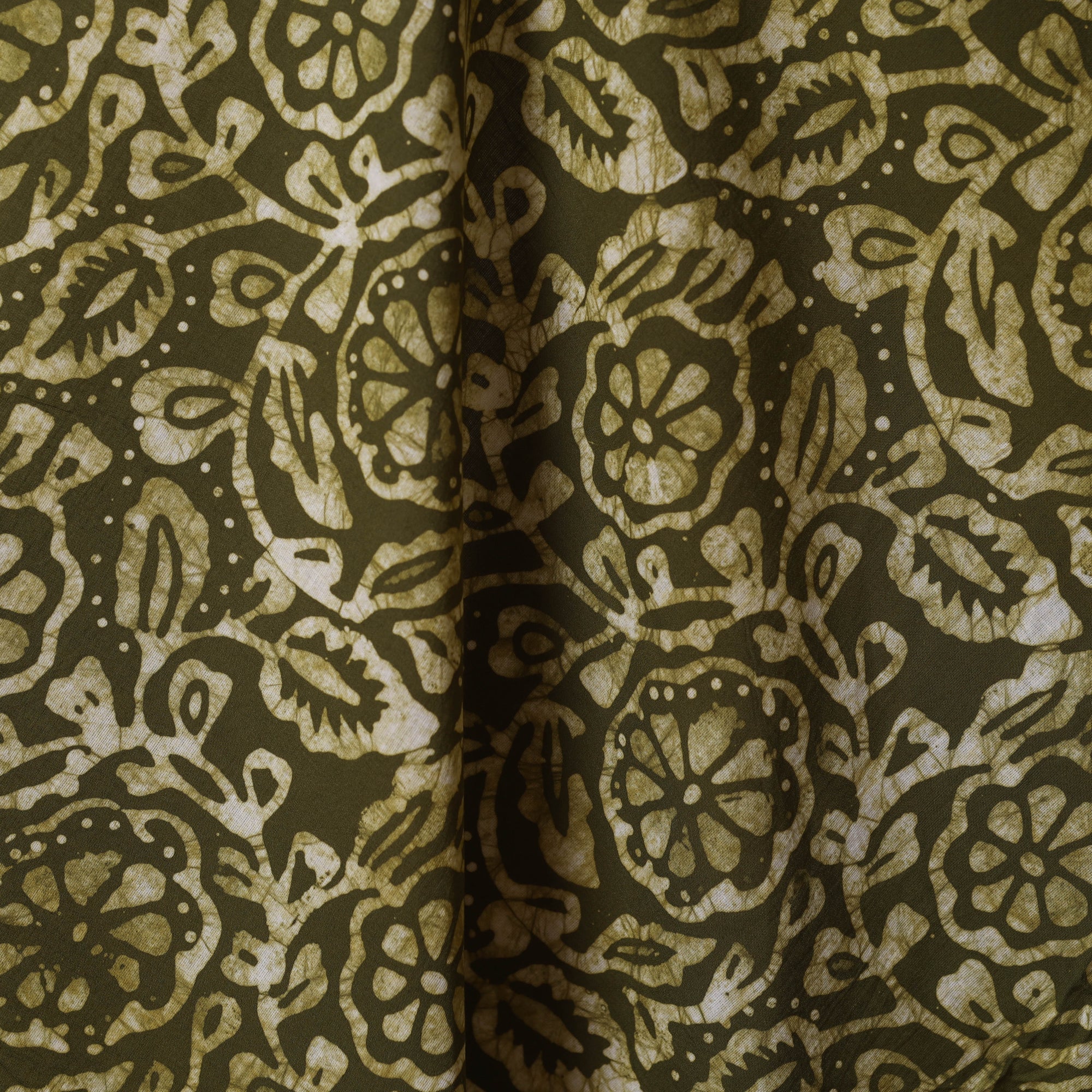 This green hand batik block-printed fabric is created using the centuries-old wax-resist dyeing technique, where molten wax is applied before dyeing to form intricate motifs. Crafted in breathable cotton, it blends durability with comfort, making it ideal for ethnic wear, casual outfits, or decor projects.