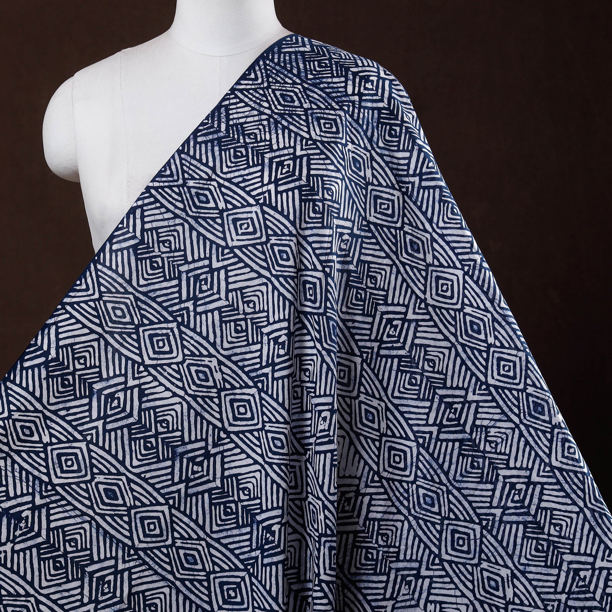 Blue hand batik block-printed fabric is created using the centuries-old wax-resist dyeing technique, where molten wax is applied before dyeing to form intricate motifs. Crafted in breathable cotton, it blends durability with comfort, making it ideal for ethnic wear, casual outfits or decor projects.