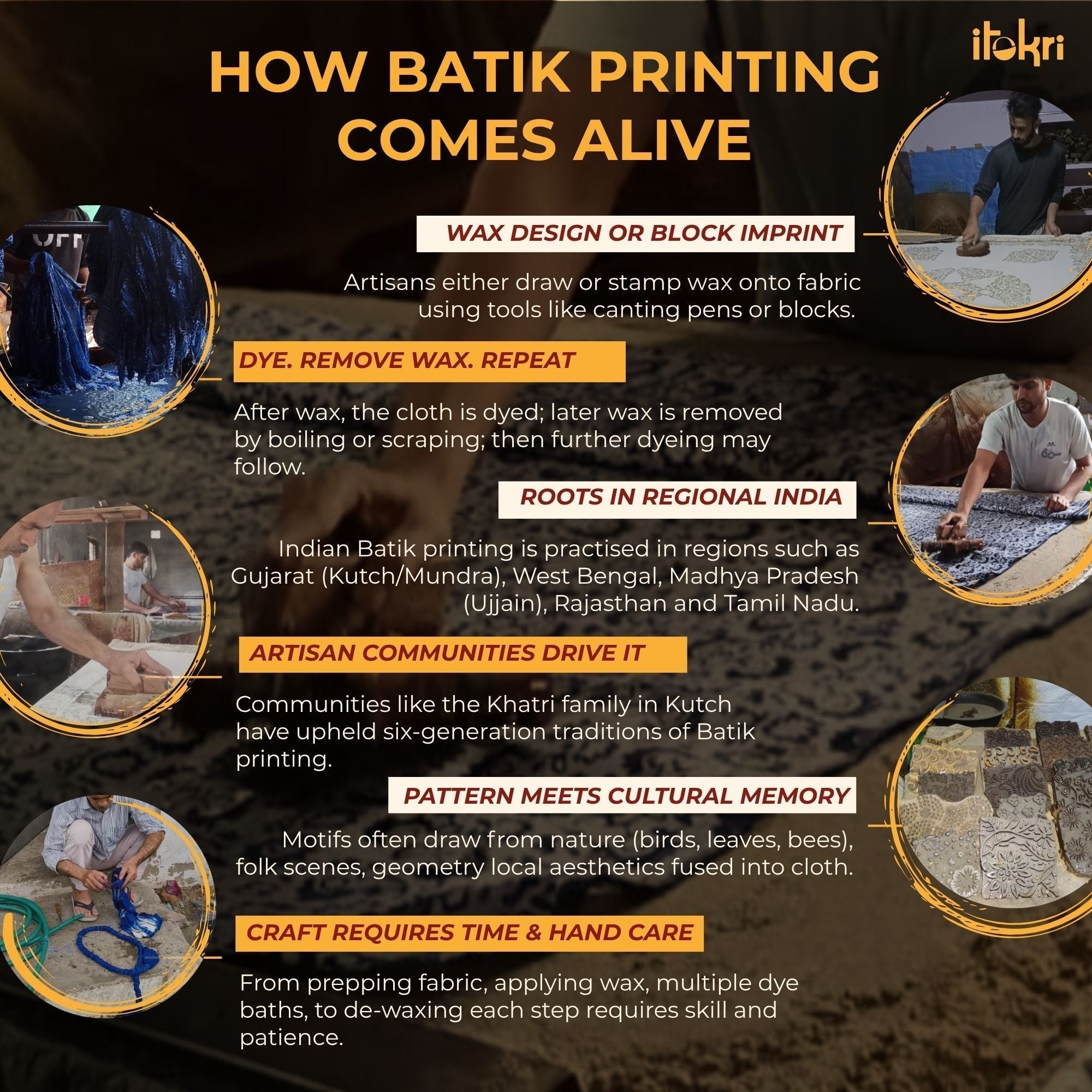 Batik is a very famous technique of wax-resist dyeing applied to whole cloth. The traditional designs and motifs in Indian batik are exceptional. It is a type of resist printing process wherein wax is applied to the fabric in specific areas.