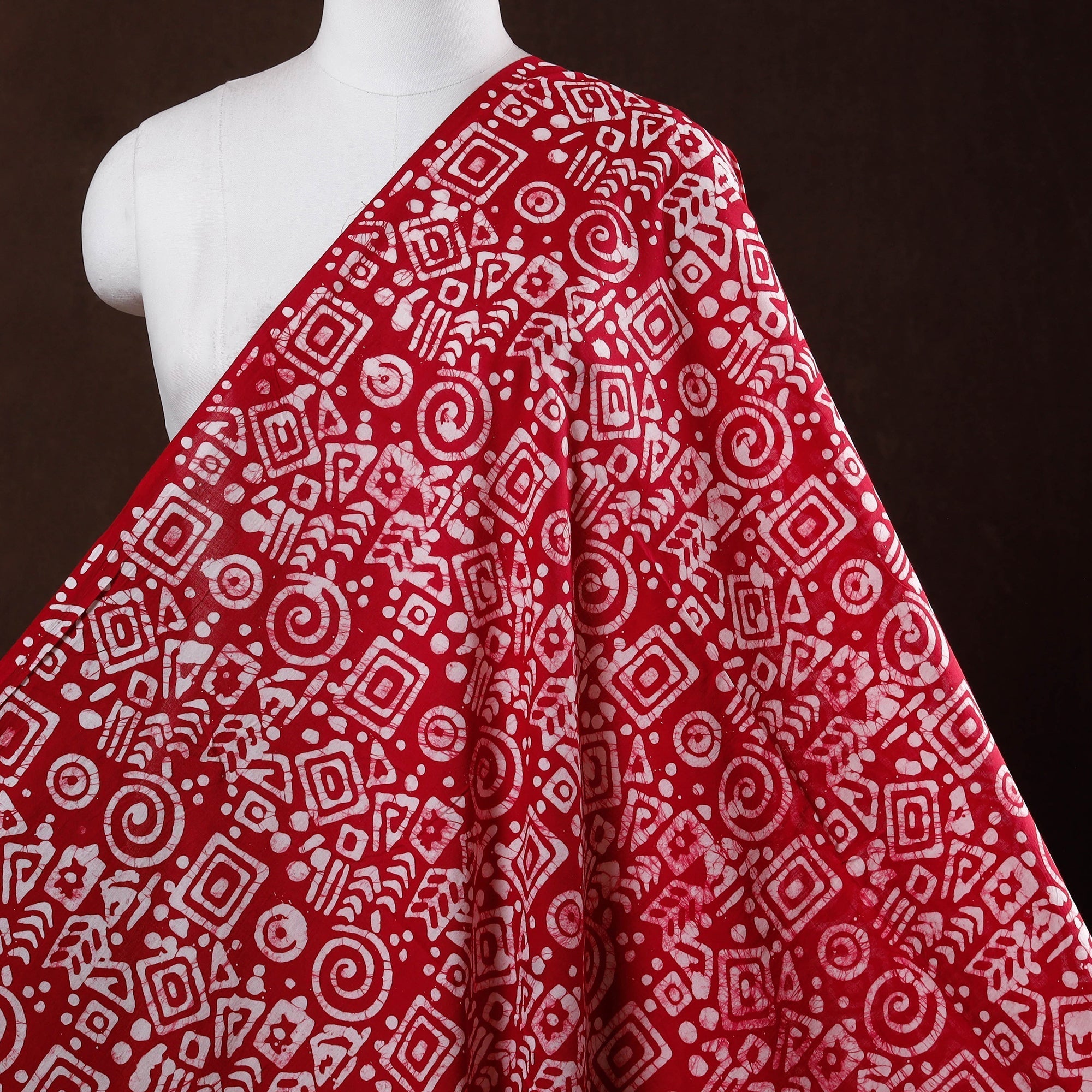 Red hand batik block-printed fabric is created using the centuries-old wax-resist dyeing technique, where molten wax is applied before dyeing to form intricate motifs. Crafted in breathable cotton, it blends durability with comfort, making it ideal for ethnic wear, casual outfits or decor projects.