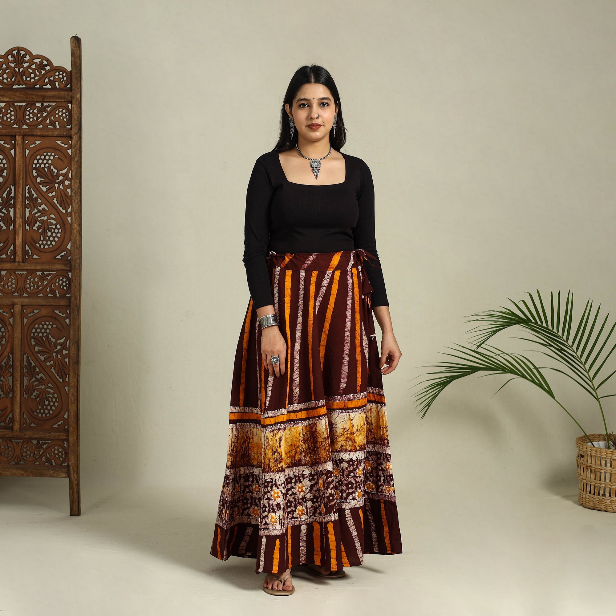 This maroon hand batik print cotton long skirt showcases intricate batik patterns created using the traditional wax-resist dyeing method. Designs like these are often passed down through generations. The skirt’s airy feel makes it perfect for all-day comfort. Pair it with your favourite top for everyday wear or dress it up for a festive or special occasion.