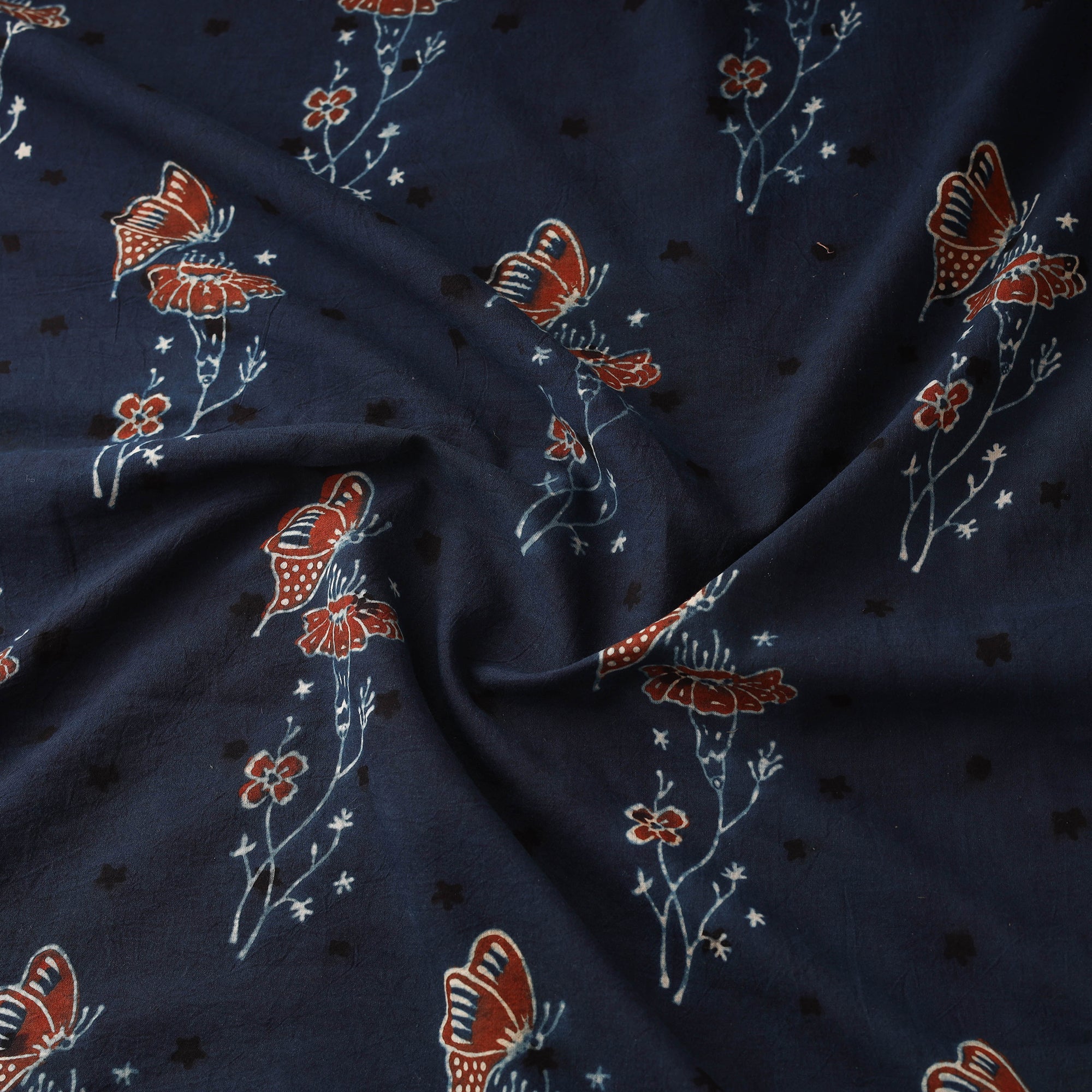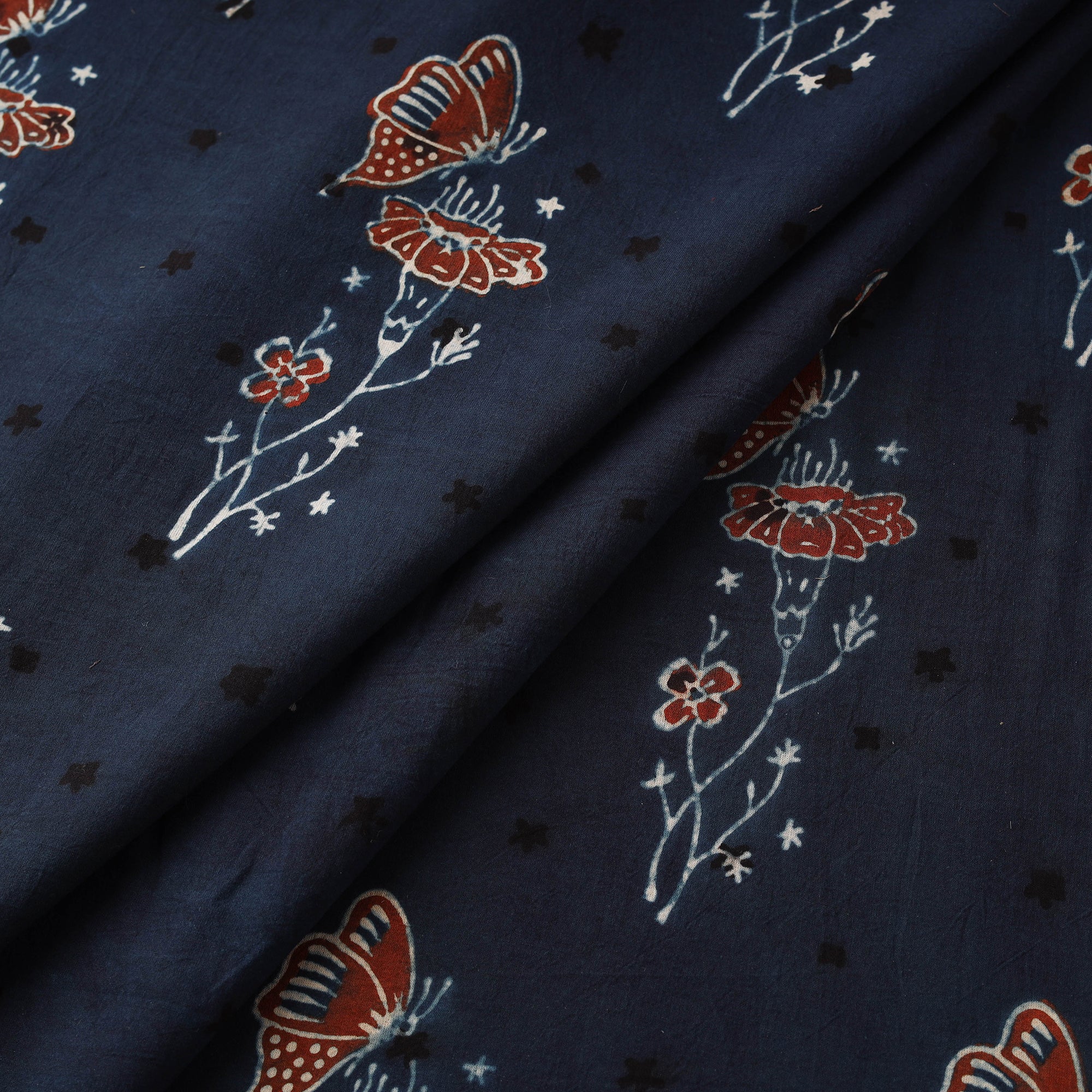 Ajrakh hand block print cotton fabric by artisan Jabbar Khatri crafted using natural dyeing and resist block-printing techniques. This ancient craft is estimated to be around 4,500 years old. The Ajrakh artisans in India originally migrated from Sindh to the Kutch region of Gujarat and to Barmer in Rajasthan. Ajrakh is also the traditional attire of the Maldhari pastoral community of Bhuj. The process is long and detailed, involving multiple stages where each layer of colour is printed only after a resting period, allowing the cloth to absorb the dye fully. Soft and breathable cotton makes it ideal for creating kurtas, shirts, dresses or home decor items.