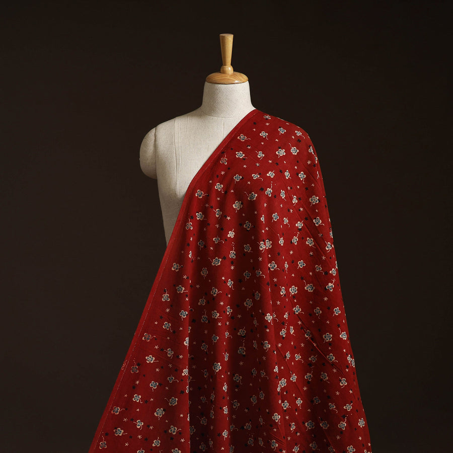 Ajrakh hand block print cotton fabric by artisan Jabbar Khatri crafted using natural dyeing and resist block-printing techniques. This ancient craft is estimated to be around 4,500 years old. The Ajrakh artisans in India originally migrated from Sindh to the Kutch region of Gujarat and to Barmer in Rajasthan. Ajrakh is also the traditional attire of the Maldhari pastoral community of Bhuj. The process is long and detailed, involving multiple stages where each layer of colour is printed only after a resting period, allowing the cloth to absorb the dye fully. Soft and breathable cotton makes it ideal for creating kurtas, shirts, dresses or home decor items.