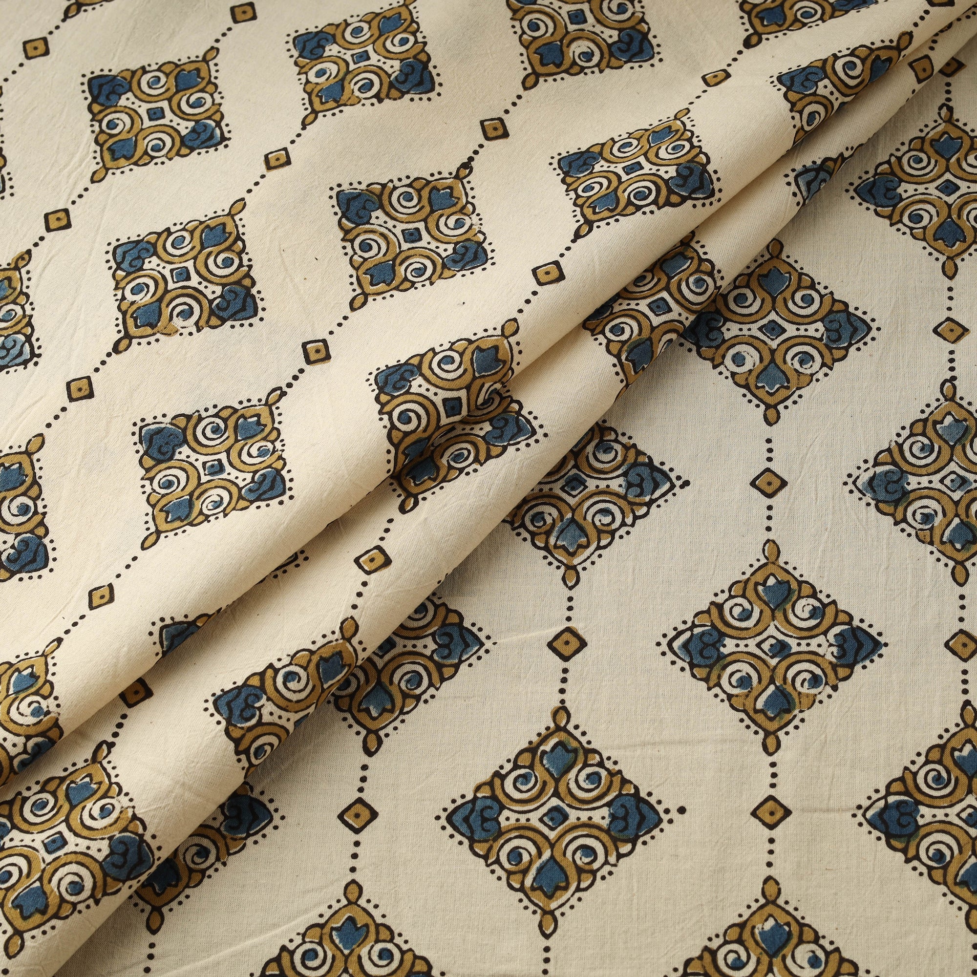 Ajrakh hand block print cotton fabric by artisan Jabbar Khatri crafted using natural dyeing and resist block-printing techniques. This ancient craft is estimated to be around 4,500 years old. The Ajrakh artisans in India originally migrated from Sindh to the Kutch region of Gujarat and to Barmer in Rajasthan. Ajrakh is also the traditional attire of the Maldhari pastoral community of Bhuj. The process is long and detailed, involving multiple stages where each layer of colour is printed only after a resting period, allowing the cloth to absorb the dye fully. Soft and breathable cotton makes it ideal for creating kurtas, shirts, dresses or home decor items.