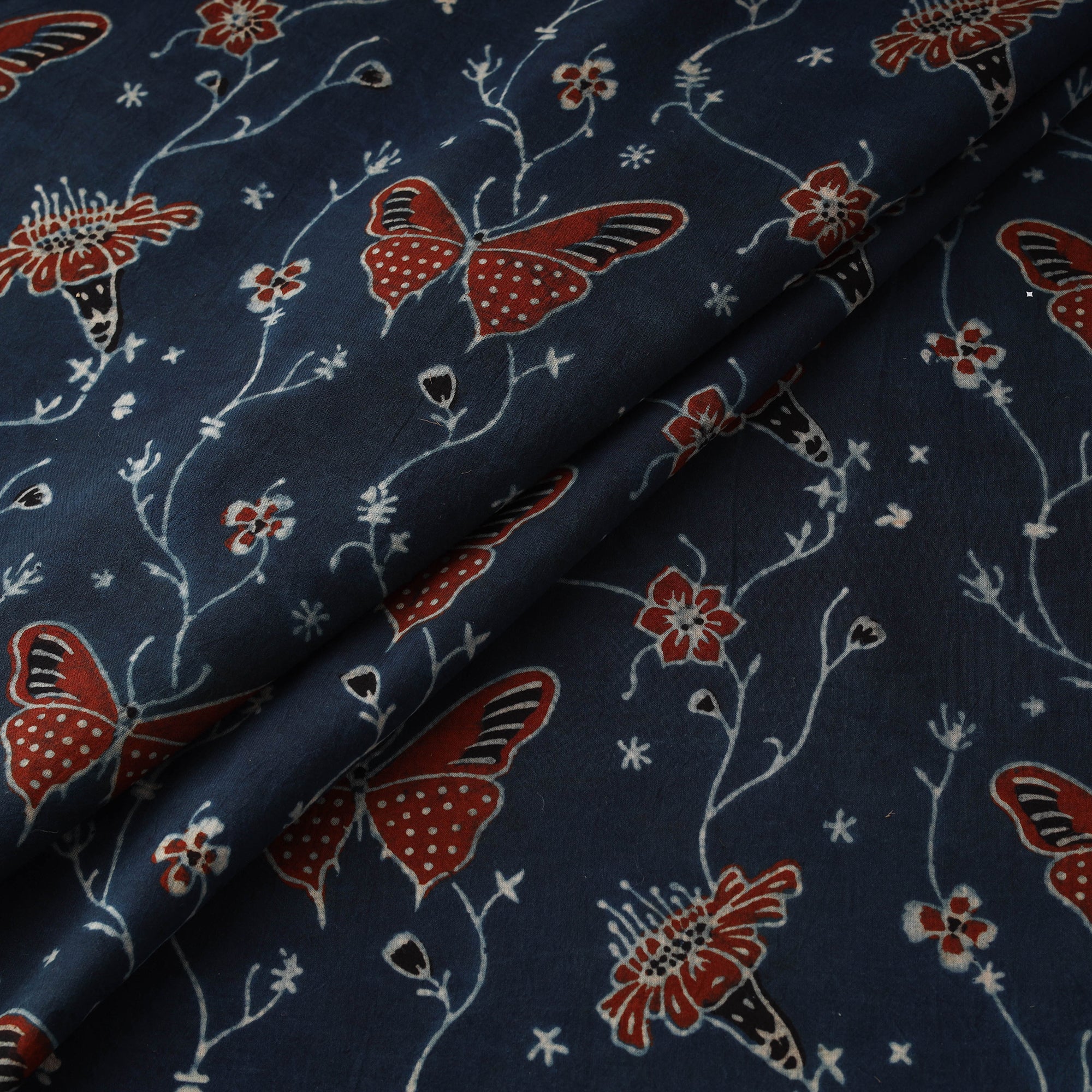 Ajrakh hand block print cotton fabric by artisan Jabbar Khatri crafted using natural dyeing and resist block-printing techniques. This ancient craft is estimated to be around 4,500 years old. The Ajrakh artisans in India originally migrated from Sindh to the Kutch region of Gujarat and to Barmer in Rajasthan. Ajrakh is also the traditional attire of the Maldhari pastoral community of Bhuj. The process is long and detailed, involving multiple stages where each layer of colour is printed only after a resting period, allowing the cloth to absorb the dye fully. Soft and breathable cotton makes it ideal for creating kurtas, shirts, dresses or home decor items.