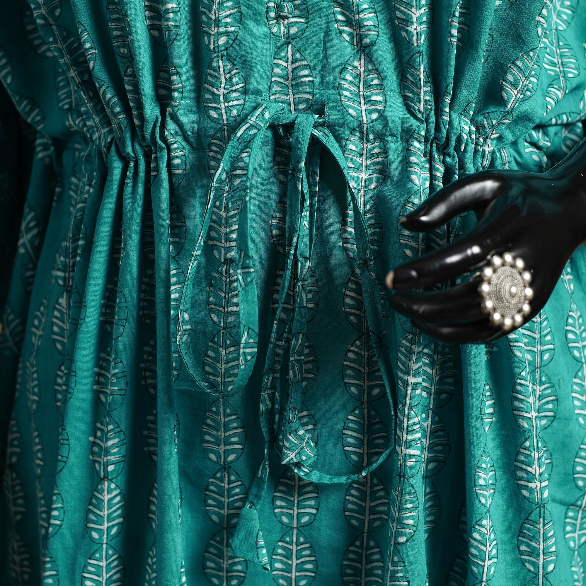 Green akola long kaftan is made from naturally dyed hand block printed cotton using traditional akola techniques. The fabric stays breathable and easy on the skin. Its relaxed fall, adjustable waist tie and roomy cut offer a comfortable, flattering fit. Ideal for holidays, casual outings or evening wear.