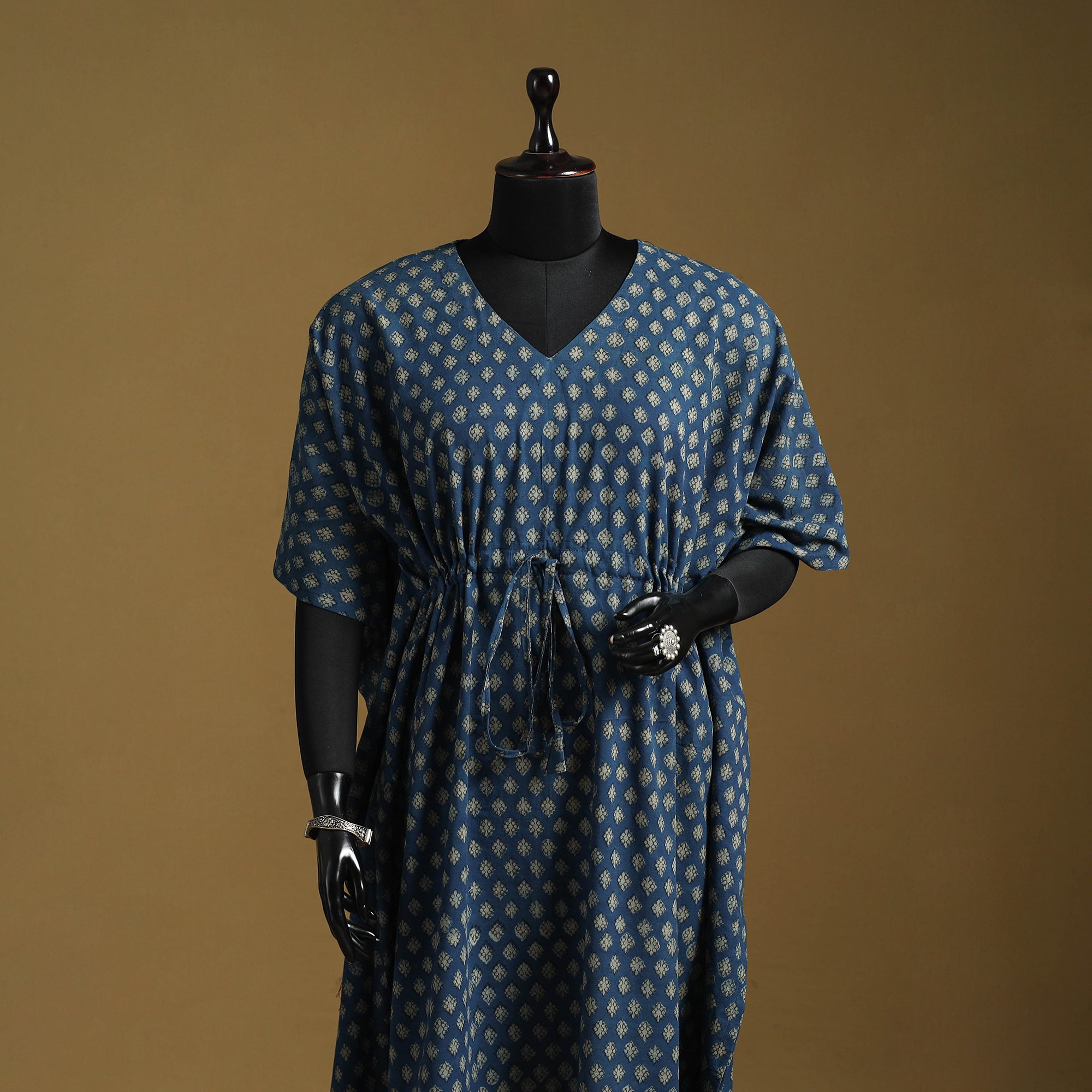 Blue akola long kaftan is made from naturally dyed hand block printed cotton using traditional akola techniques. The fabric stays breathable and easy on the skin. Its relaxed fall, adjustable waist tie and roomy cut offer a comfortable, flattering fit. Ideal for holidays, casual outings or evening wear.