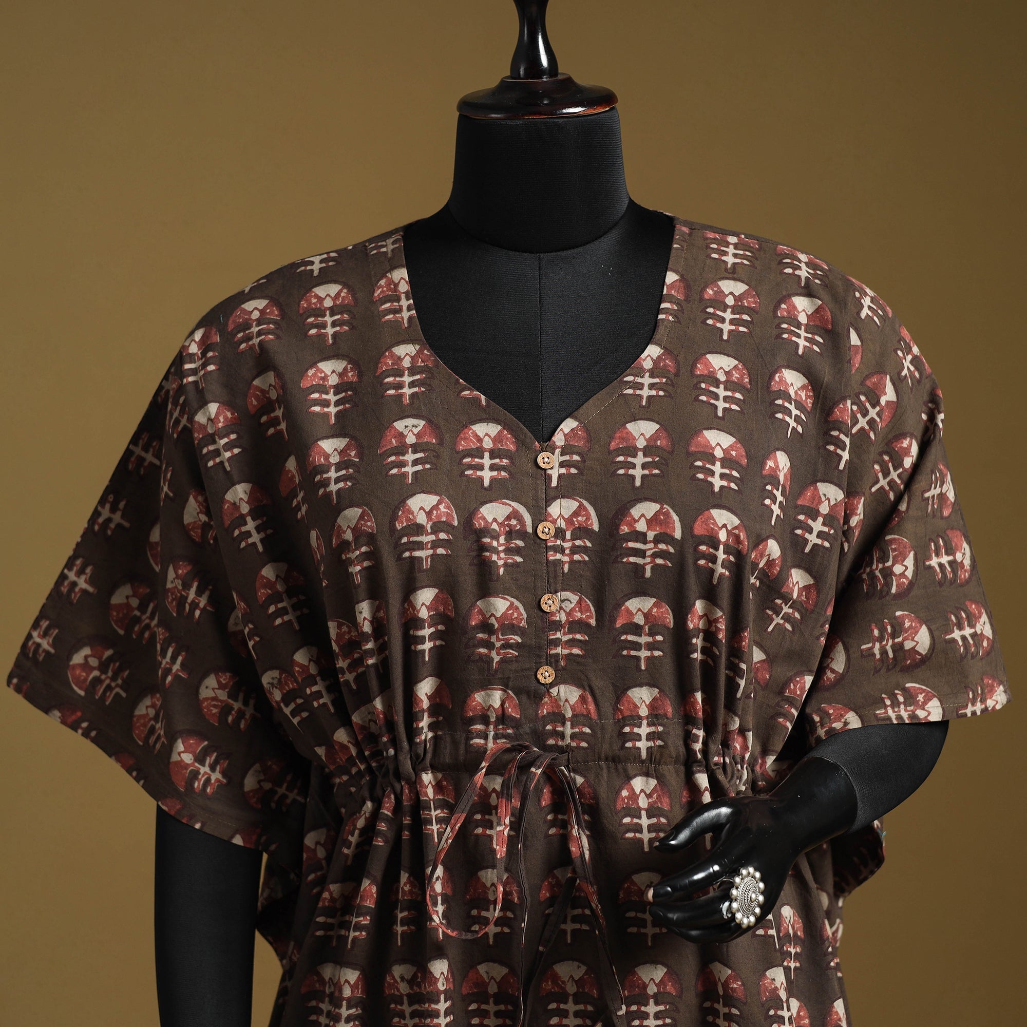 Brown akola short kaftan is made from naturally dyed, hand block printed cotton using traditional akola techniques. The fabric stays breathable and easy on the skin. Its relaxed fall, adjustable waist tie and roomy cut offer a comfortable, flattering fit. Ideal for holidays, casual outings or evening wear.