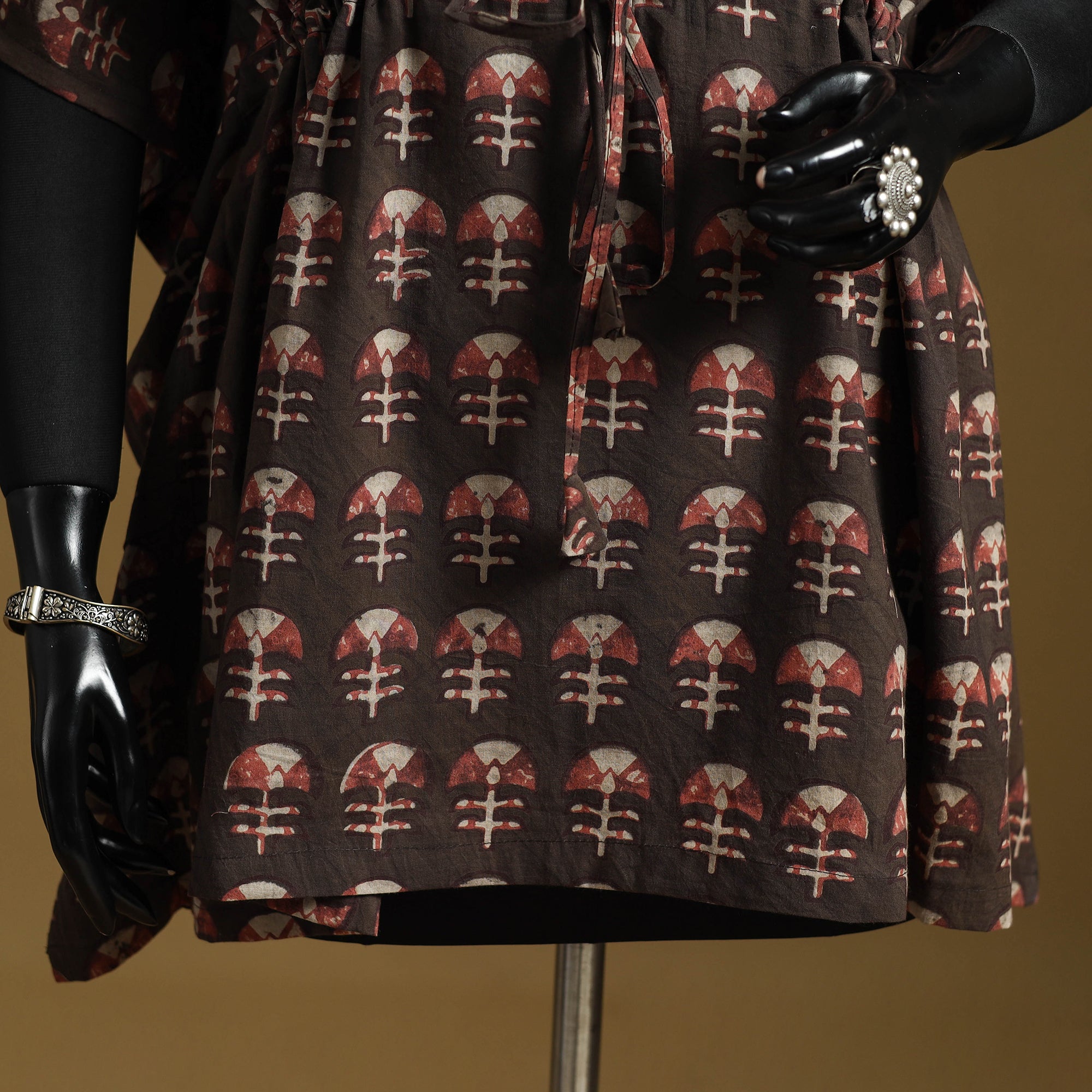 Brown akola short kaftan is made from naturally dyed, hand block printed cotton using traditional akola techniques. The fabric stays breathable and easy on the skin. Its relaxed fall, adjustable waist tie and roomy cut offer a comfortable, flattering fit. Ideal for holidays, casual outings or evening wear.