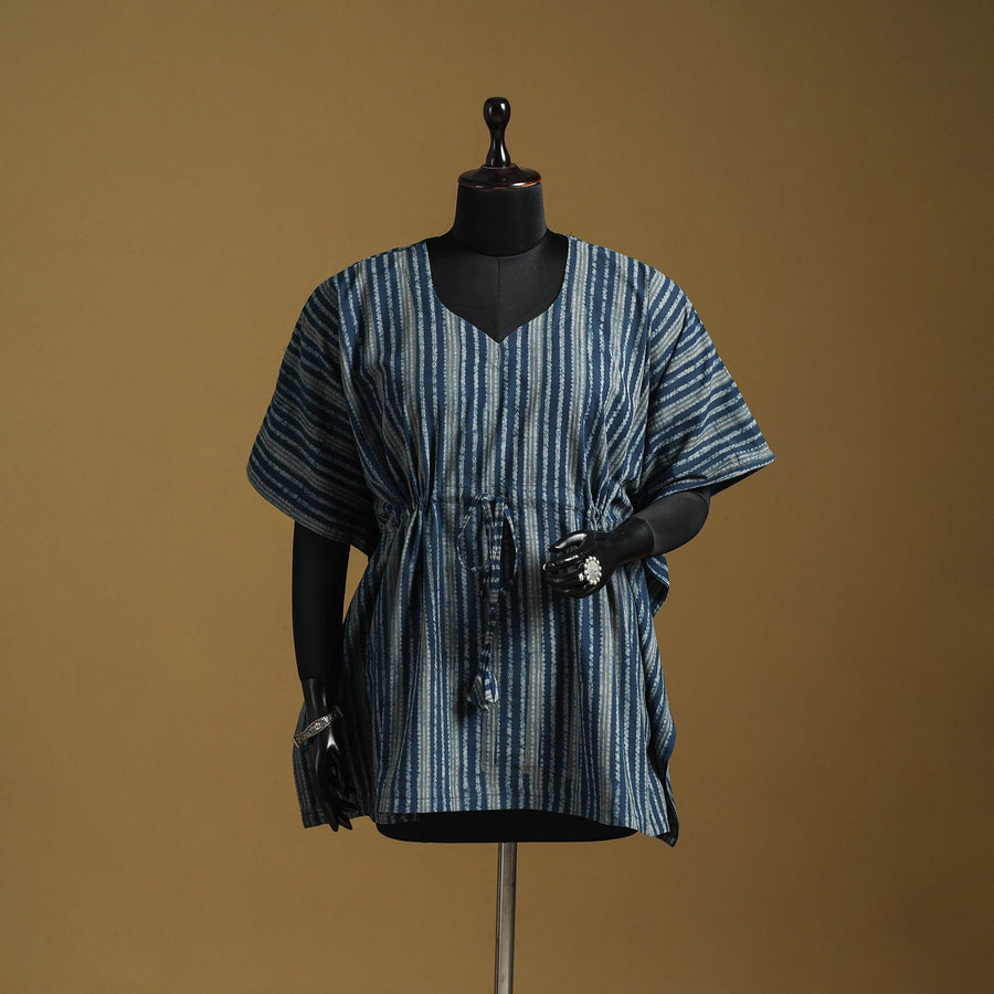 Blue akola short kaftan is made from naturally dyed, hand block printed cotton using traditional akola techniques. The fabric stays breathable and easy on the skin. Its relaxed fall, adjustable waist tie and roomy cut offer a comfortable, flattering fit. Ideal for holidays, casual outings or evening wear.