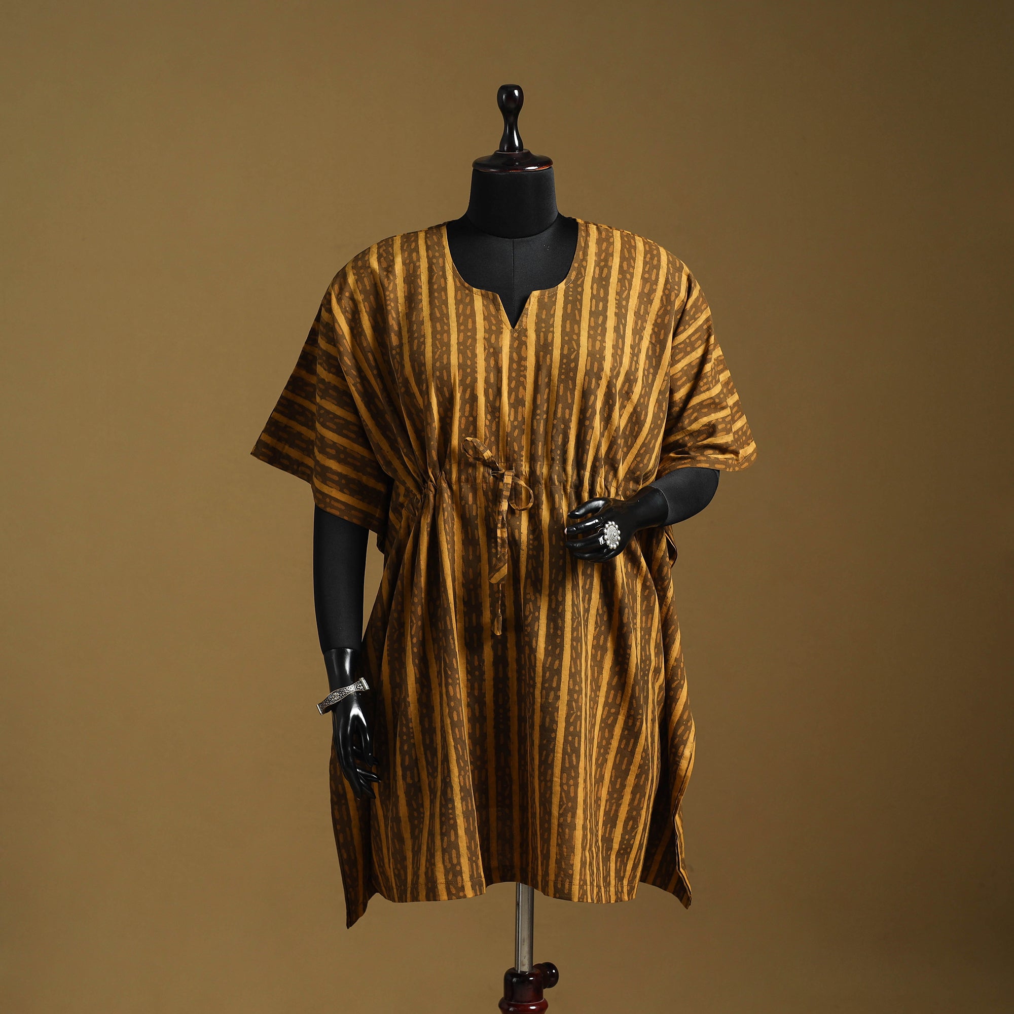 Yellow akola short kaftan is made from naturally dyed, hand block printed cotton using traditional akola techniques. The fabric stays breathable and easy on the skin. Its relaxed fall, adjustable waist tie and roomy cut offer a comfortable, flattering fit. Ideal for holidays, casual outings or evening wear.