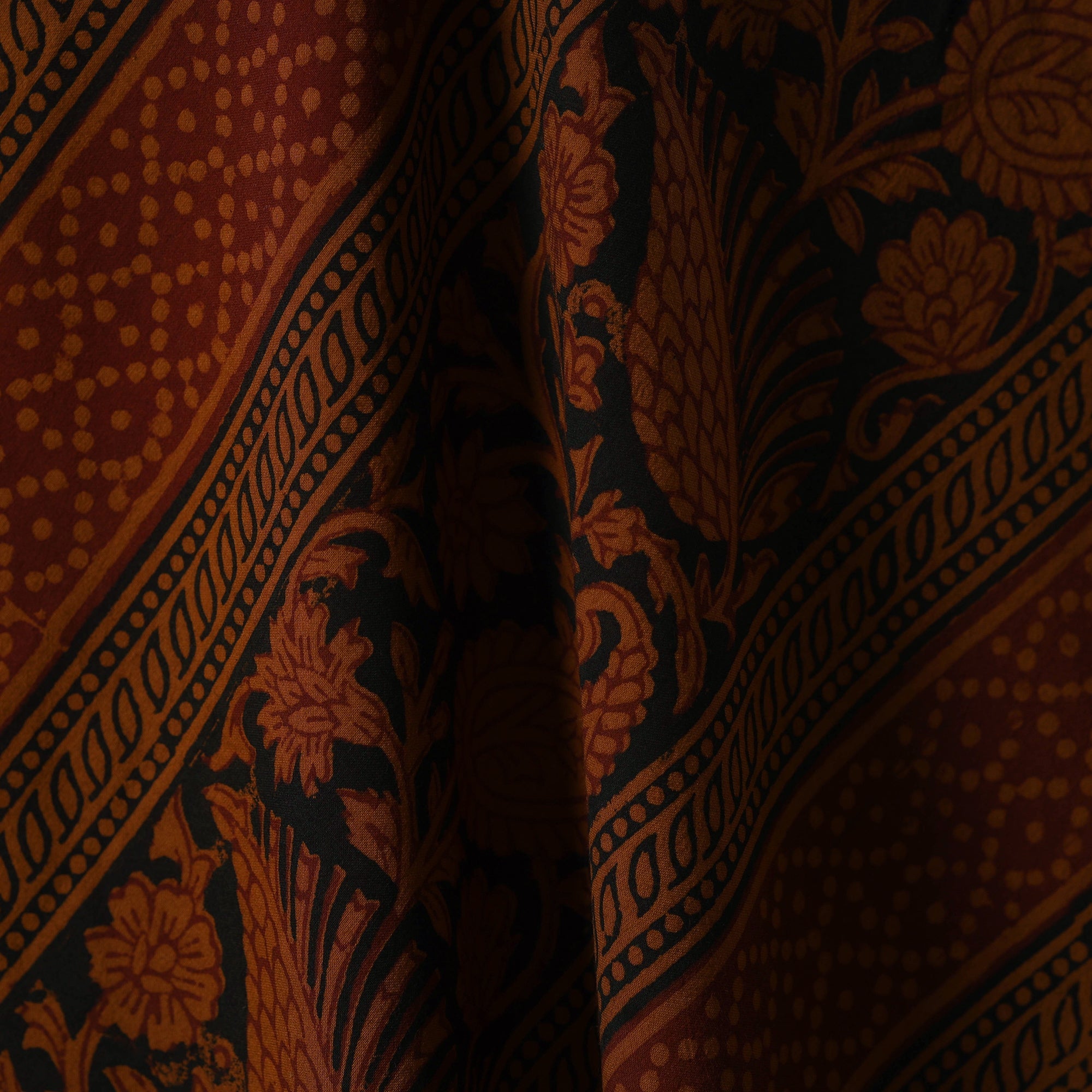 Maroon baagh fabric is hand block printed by master artisan Umar Faruq Khatri from Madhya Pradesh. Crafted using natural dyes and traditional techniques, it features geometric motifs on cotton. Each design is carefully created using wooden blocks, making it perfect for clothing, home decor or creative projects.