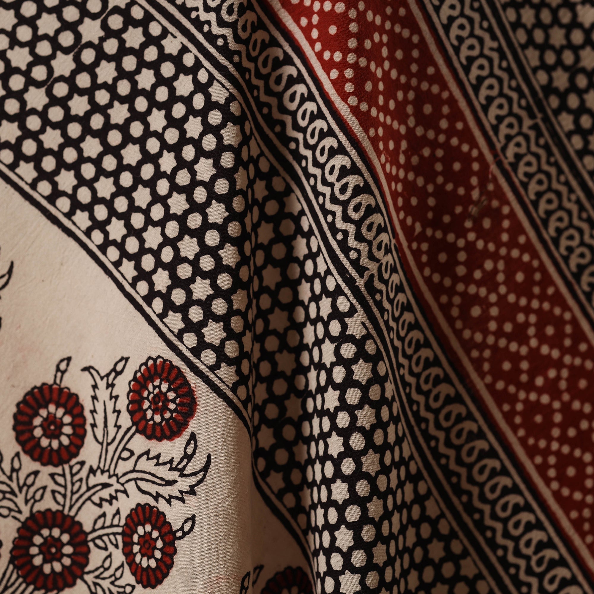 Bagh layouts are dramatic with the use of black and red alternately on a white background. Its production process is manually painstaking. Though the techniques and designs are age-old the prints retain their contemporary appeal.