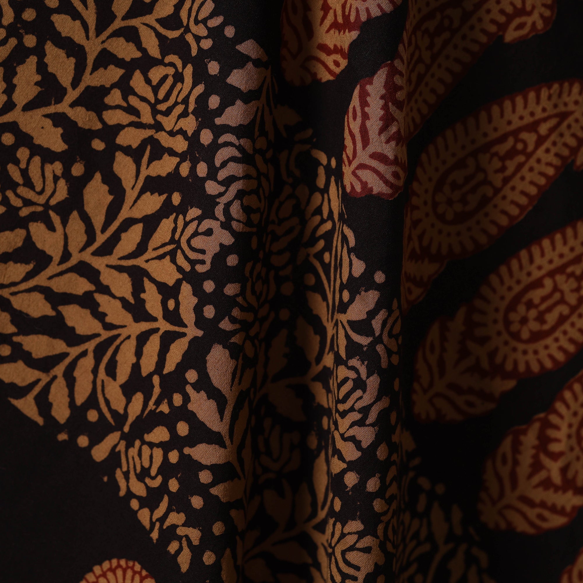 Black bagh fabric is hand block printed by master artisan Umar Faruq Khatri from Madhya Pradesh. Crafted using natural dyes and traditional techniques, it features geometric motifs on cotton. Each design is carefully created using wooden blocks, making it perfect for clothing, home decor or creative projects.