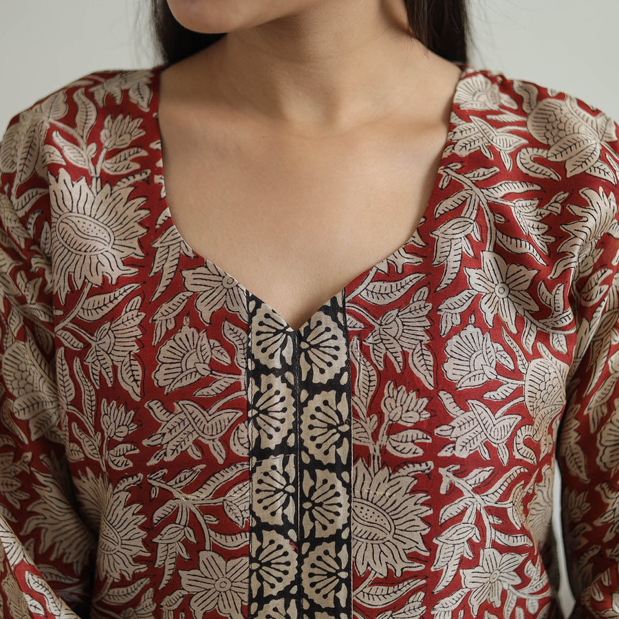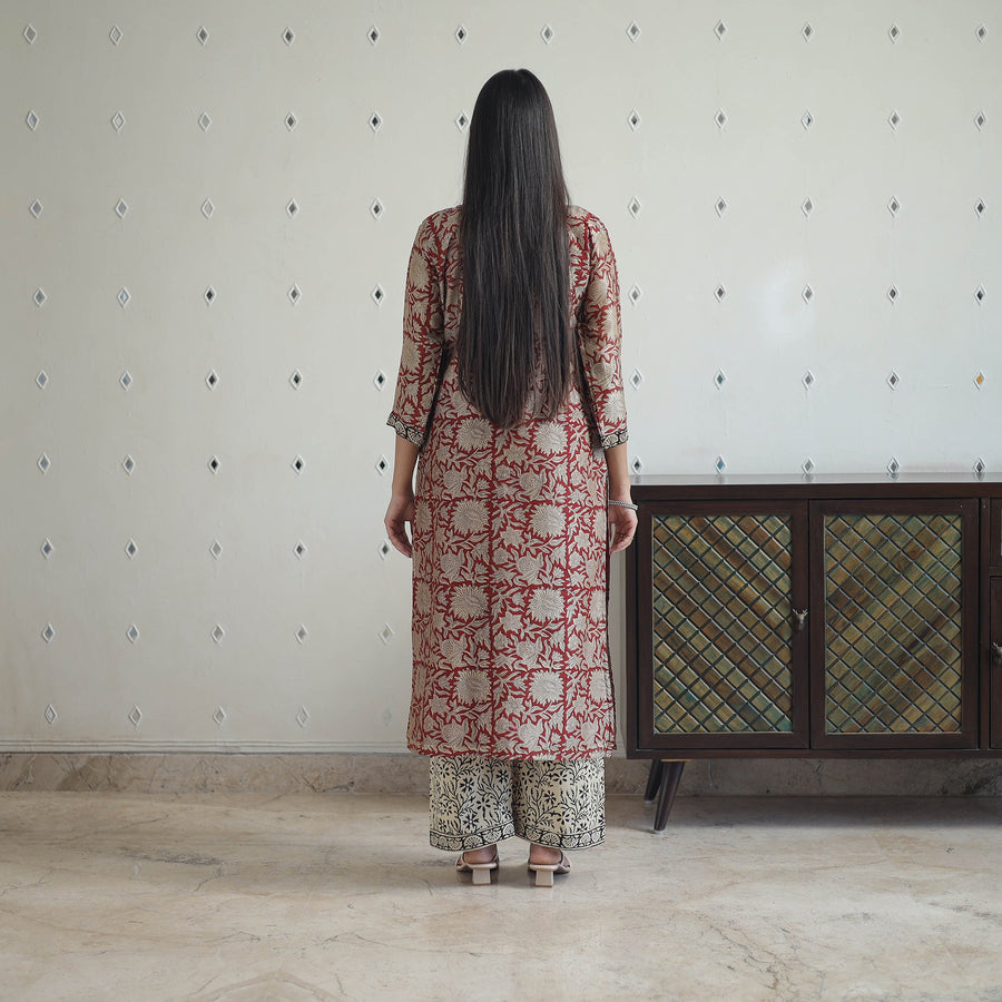 | Material | Step up your style with our red hand block bagru print chanderi silk kurta set . This ensemble includes a stylish kurta with one side pocket, comfortable cotton palazzo with an elasticized waist & two side pockets, and a zari-bordered dupatta, all featuring traditional Bagru block print motifs. Each piece is handcrafted by skilled artisans, preserving traditional techniques. Perfect for festive occasions or casual elegance, this suit reflects timeless artistry. |