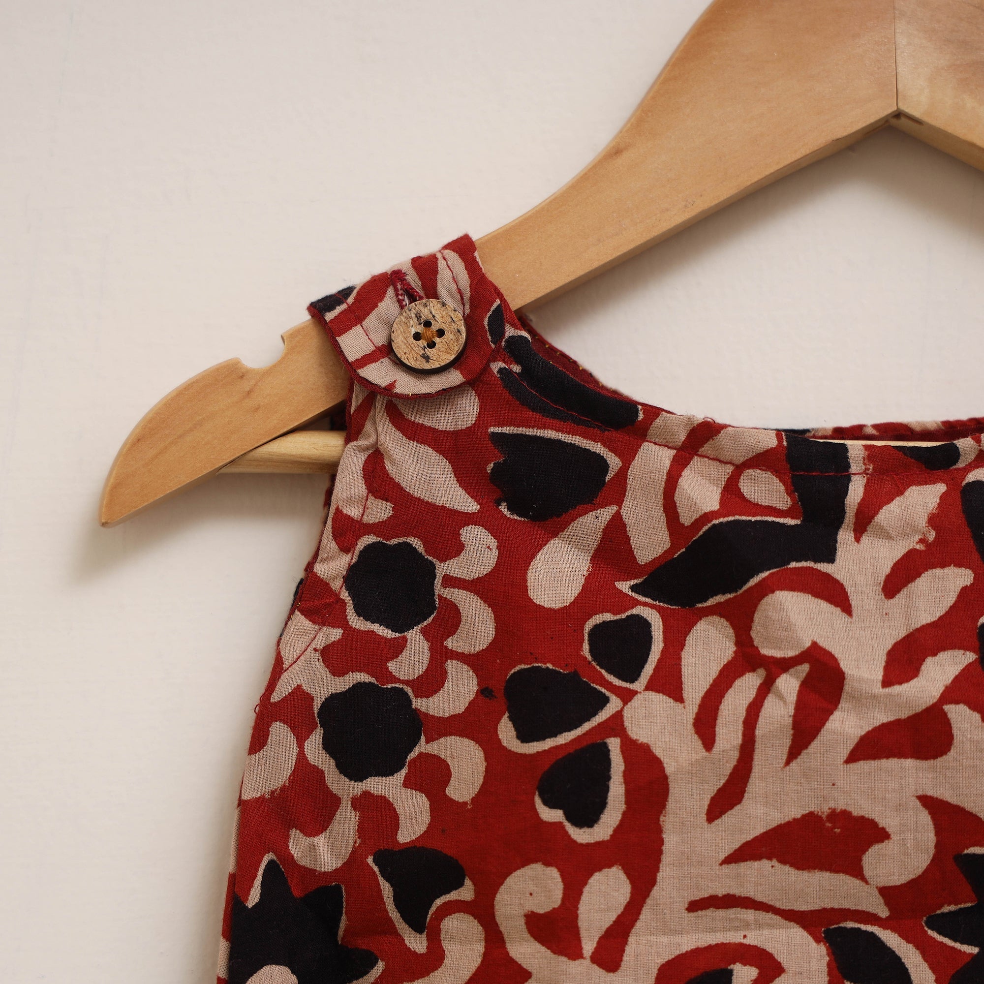 | Material | Red bagru print sleeveless baby girl dress features round neck and openable shoulder with wooden button closure. Made from 100% pure cotton using bagru block printing technique. It is comfortable to wear and gentle on the skin, A lovely choice for your little one this dress adds charm to her everyday look. |