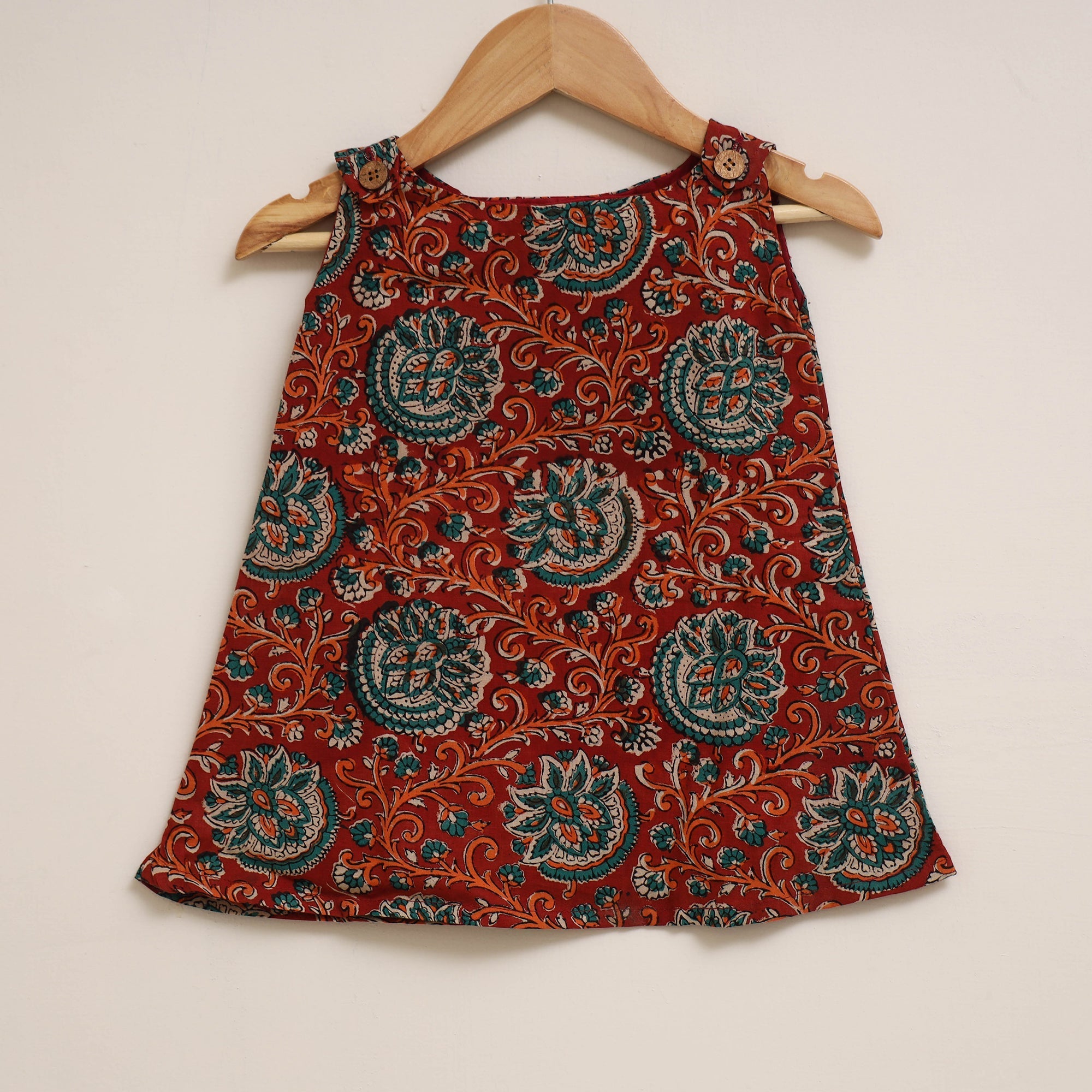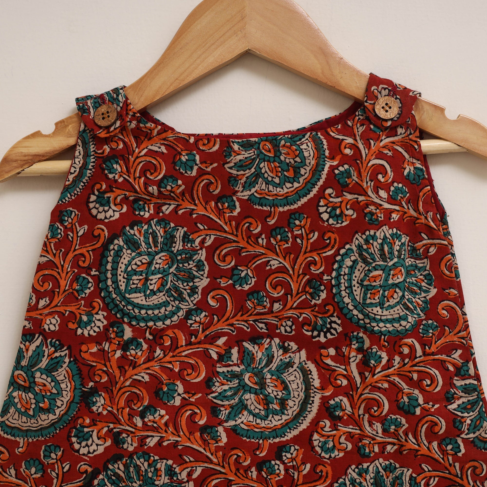 Red bagru print sleeveless baby girl dress features round neck and openable shoulder with wooden button closure. Made from 100% pure cotton using bagru block printing technique. It is comfortable to wear and gentle on the skin, A lovely choice for your little one this dress adds charm to her everyday look.