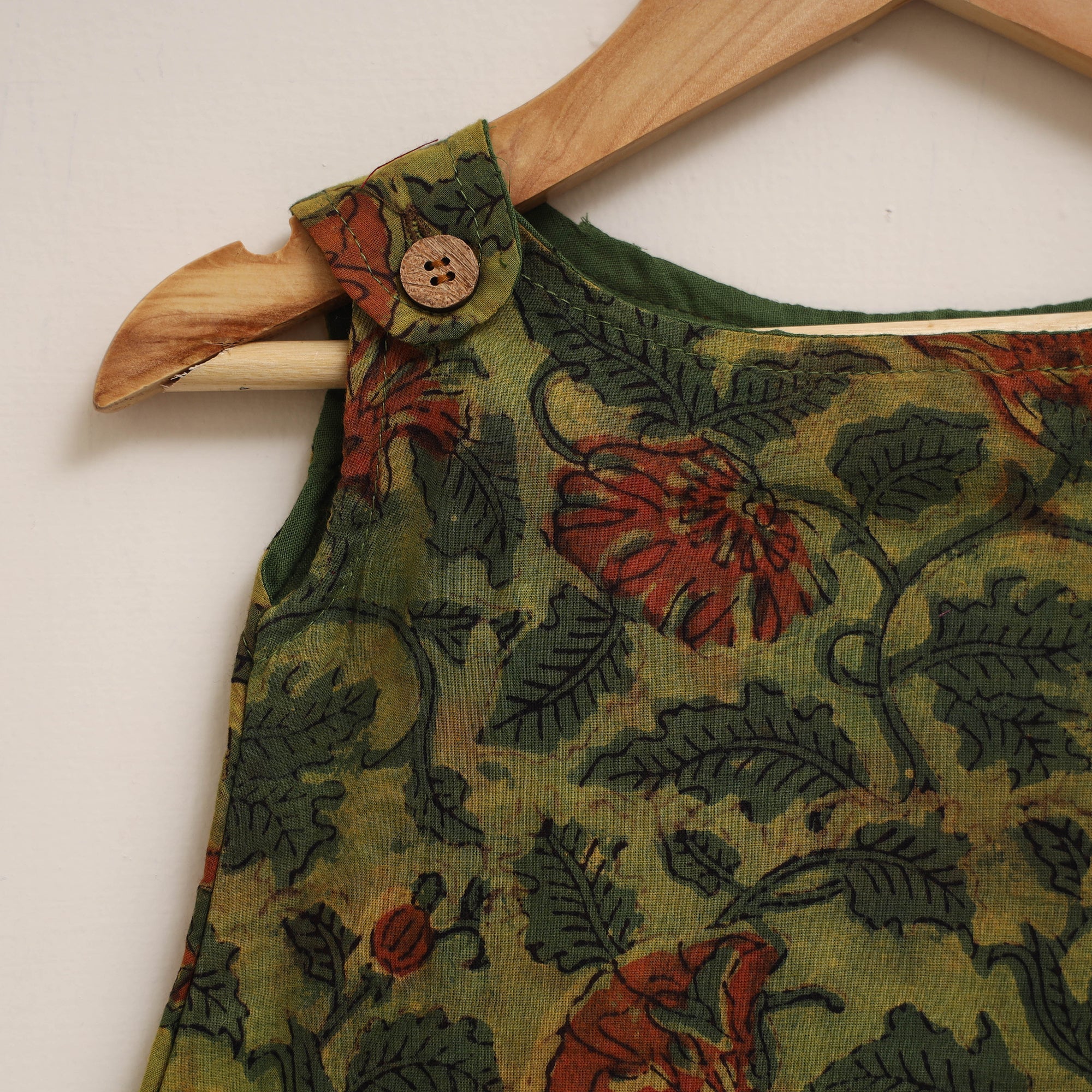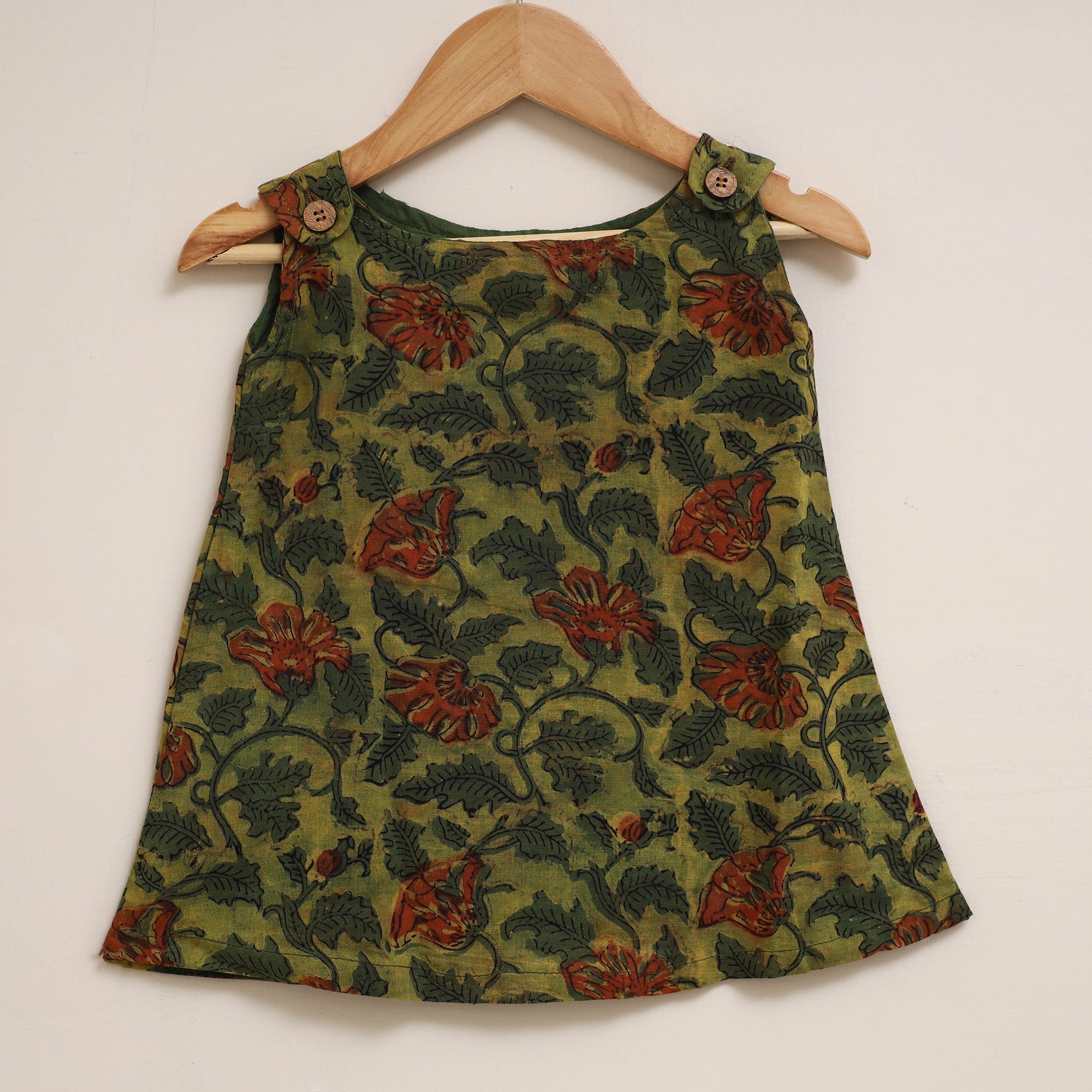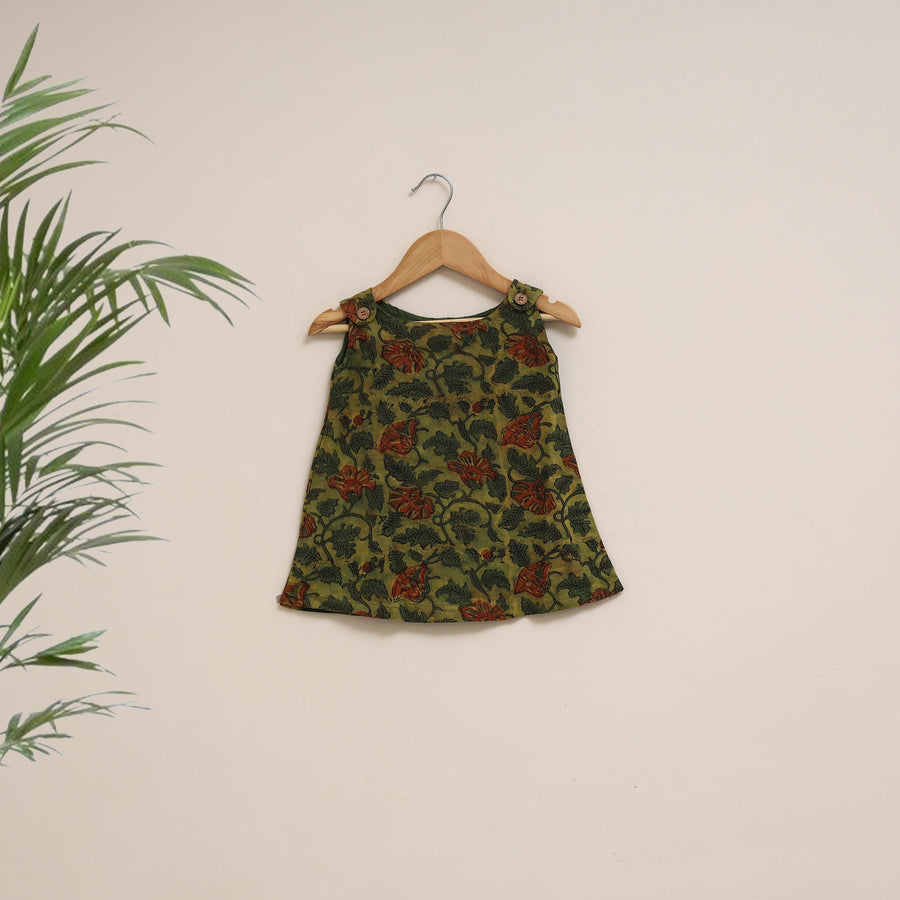 | Material | Green bagru print sleeveless baby girl dress features round neck and openable shoulder with wooden button closure. Made from 100% pure cotton using bagru block printing technique. It is comfortable to wear and gentle on the skin, A lovely choice for your little one this dress adds charm to her everyday look. |