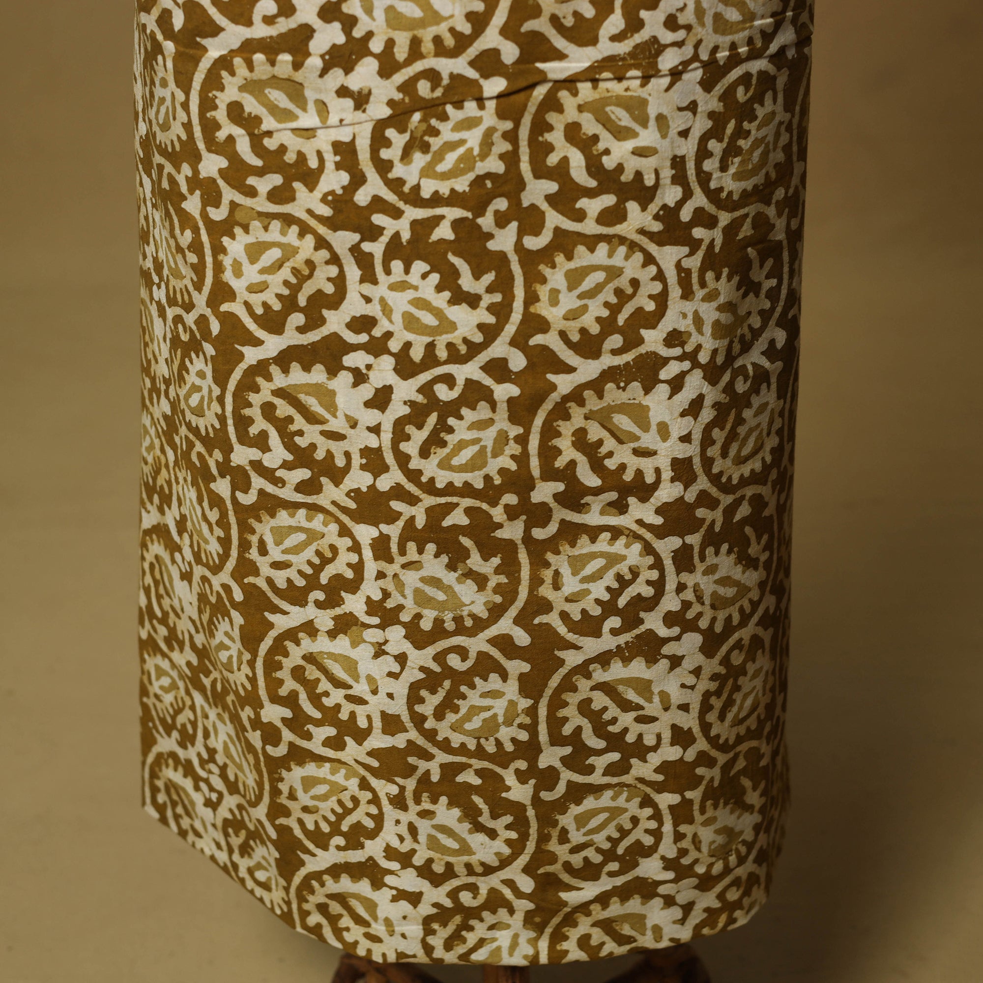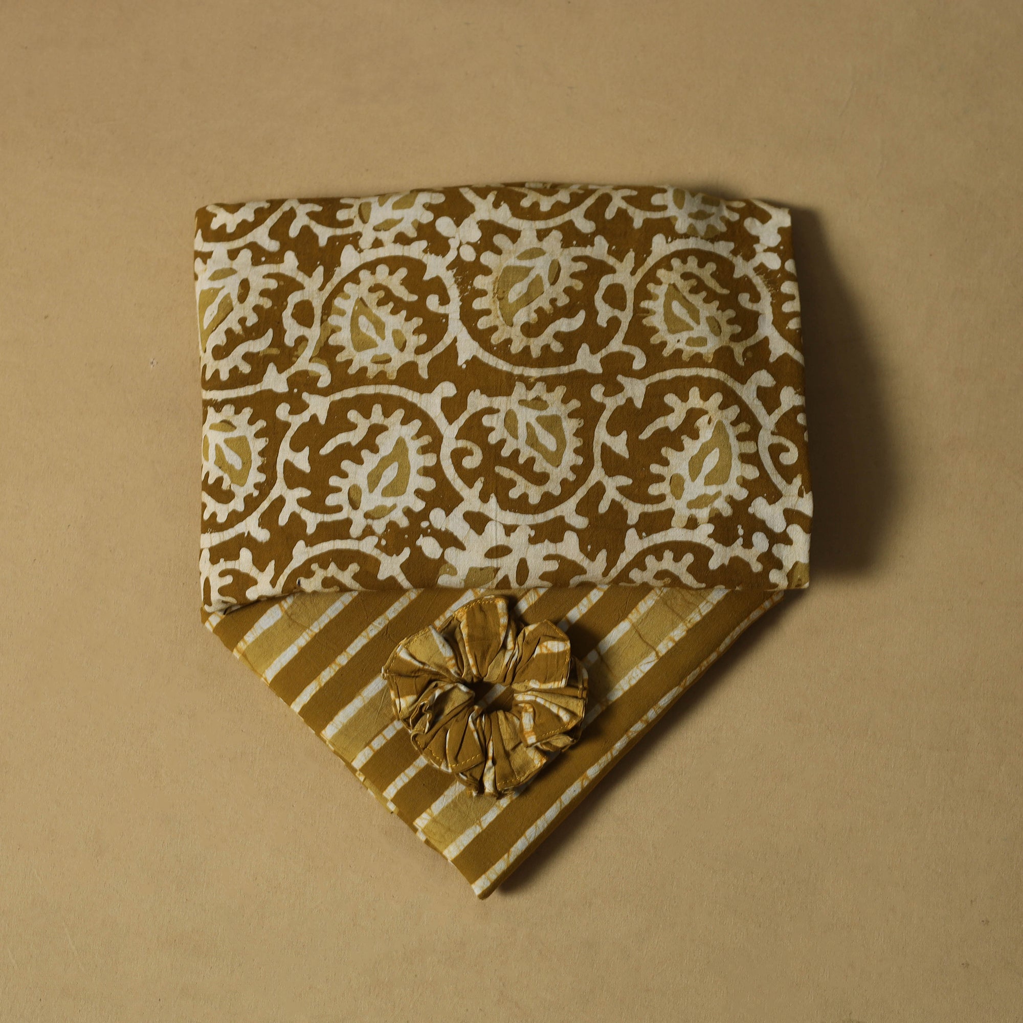 Hand block batik print cotton 2pc unstitched dress material made by skilled artisans from Kutch. Crafted using the centuries-old wax-resist dyeing technique, this set includes kurta fabric and bottom fabric, along with a matching handmade rubber band/scrunchie that adds a coordinated look. Easy to stitch and comfortable to wear, this set works well for daily wear and casual outings.