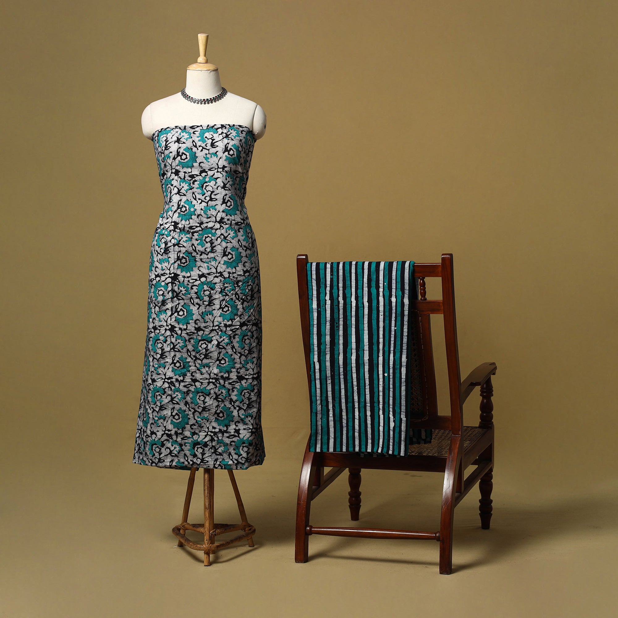 Hand block batik print cotton 2pc unstitched dress material made by skilled artisans from Kutch. Crafted using the centuries-old wax-resist dyeing technique, this set includes kurta fabric and bottom fabric, along with a matching handmade rubber band/scrunchie that adds a coordinated look. Easy to stitch and comfortable to wear, this set works well for daily wear and casual outings.