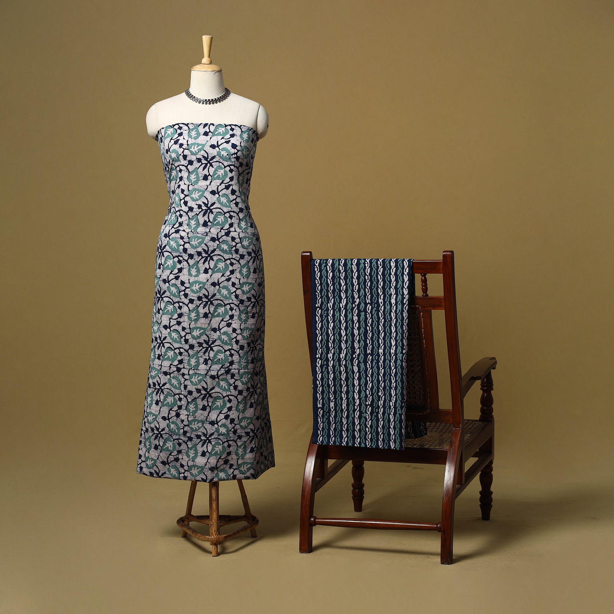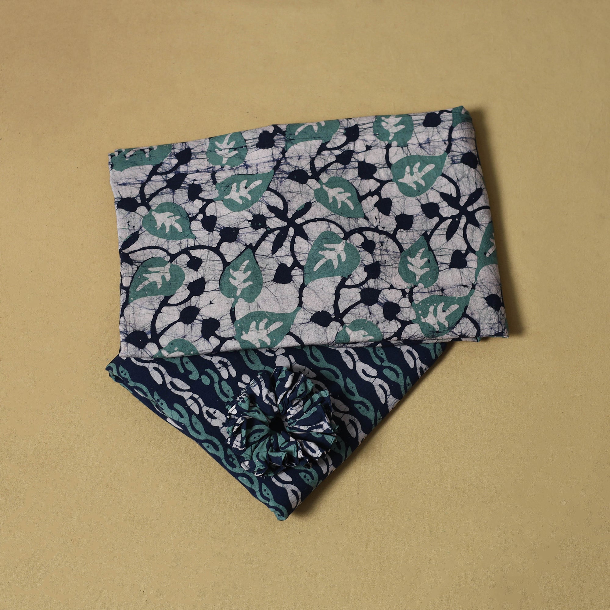 Hand block batik print cotton 2pc unstitched dress material made by skilled artisans from Kutch. Crafted using the centuries-old wax-resist dyeing technique, this set includes kurta fabric and bottom fabric, along with a matching handmade rubber band/scrunchie that adds a coordinated look. Easy to stitch and comfortable to wear, this set works well for daily wear and casual outings.