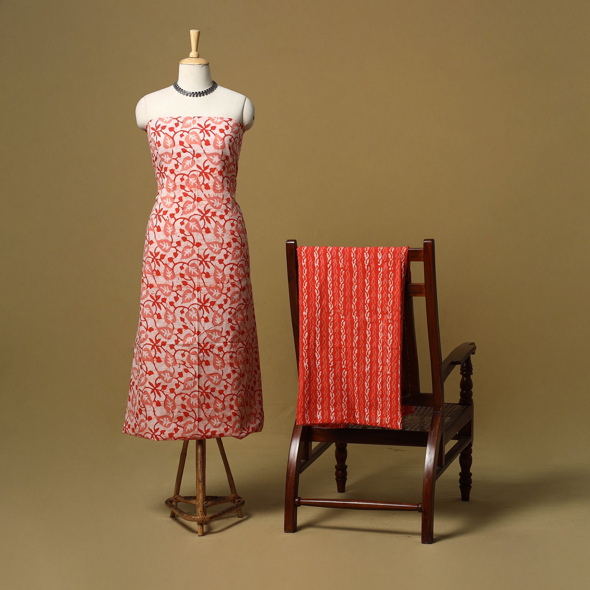 Hand block batik print cotton 2pc unstitched dress material made by skilled artisans from Kutch. Crafted using the centuries-old wax-resist dyeing technique, this set includes kurta fabric and bottom fabric, along with a matching handmade rubber band/scrunchie that adds a coordinated look. Easy to stitch and comfortable to wear, this set works well for daily wear and casual outings.
