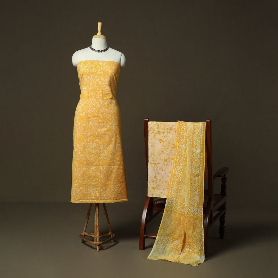 Yellow hand block batik print cotton 3pc unstitched dress material from Madhya Pradesh is handcrafted by artisan Md. Wasim using the traditional wax-resist dyeing technique, a craft believed to be over 2,000 years old. The motifs beautifully reflect regional artistry that has been passed down through generations. The set includes kurta fabric, a coordinated bottom fabric and a matching dupatta, making it a comfortable and stylish choice for special occasions as well as graceful everyday wear.Yellow