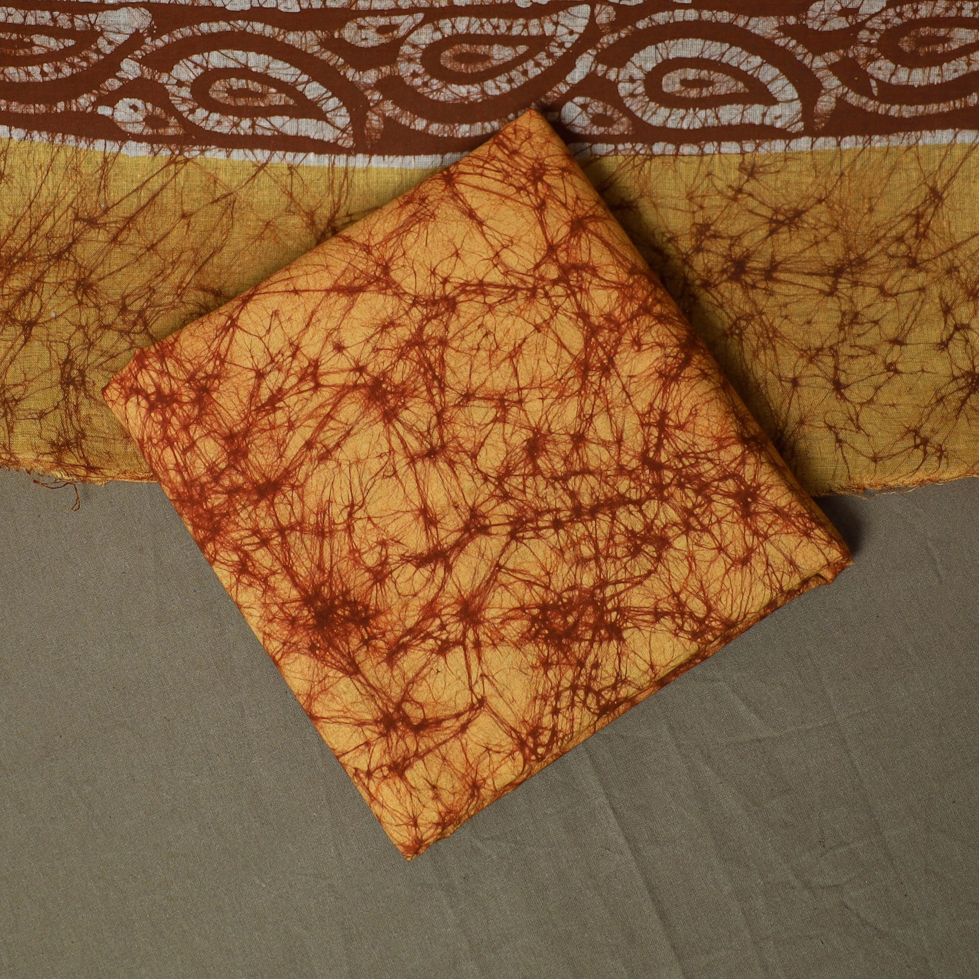 | Material | Brown hand block batik print cotton 3pc unstitched dress material from Madhya Pradesh is handcrafted by artisan Md. Wasim using the traditional wax-resist dyeing technique, a craft believed to be over 2,000 years old. The motifs beautifully reflect regional artistry that has been passed down through generations. The set includes kurta fabric, a coordinated bottom fabric and a matching dupatta, making it a comfortable and stylish choice for special occasions as well as graceful everyday wear. |
