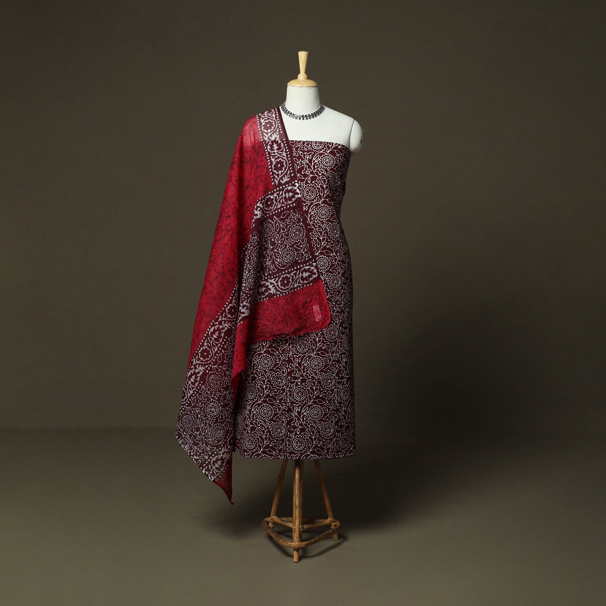 Maroon hand block batik print cotton 3pc unstitched dress material from Madhya Pradesh is handcrafted by artisan Md. Wasim using the traditional wax-resist dyeing technique, a craft believed to be over 2,000 years old. The motifs beautifully reflect regional artistry that has been passed down through generations. The set includes kurta fabric, a coordinated bottom fabric and a matching dupatta, making it a comfortable and stylish choice for special occasions as well as graceful everyday wear.