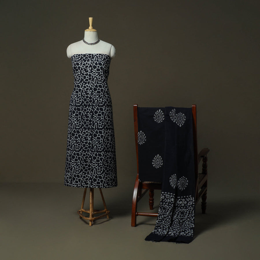 Black hand block batik print cotton 3pc unstitched dress material from Madhya Pradesh is handcrafted by artisan Md. Wasim using the traditional wax-resist dyeing technique, a craft believed to be over 2,000 years old. The motifs beautifully reflect regional artistry that has been passed down through generations. The set includes kurta fabric, a coordinated bottom fabric and a matching dupatta, making it a comfortable and stylish choice for special occasions as well as graceful everyday wear.