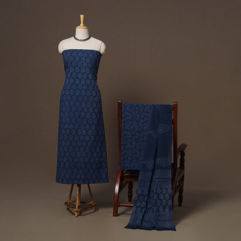 Blue hand block batik print cotton 3pc unstitched dress material is crafted using the traditional wax-resist dyeing technique, estimated to be around 2,000 years old and practised by skilled artisans. The set includes kurta fabric, a mul cotton dupatta and a bottom, which can be easily tailored into your preferred style.