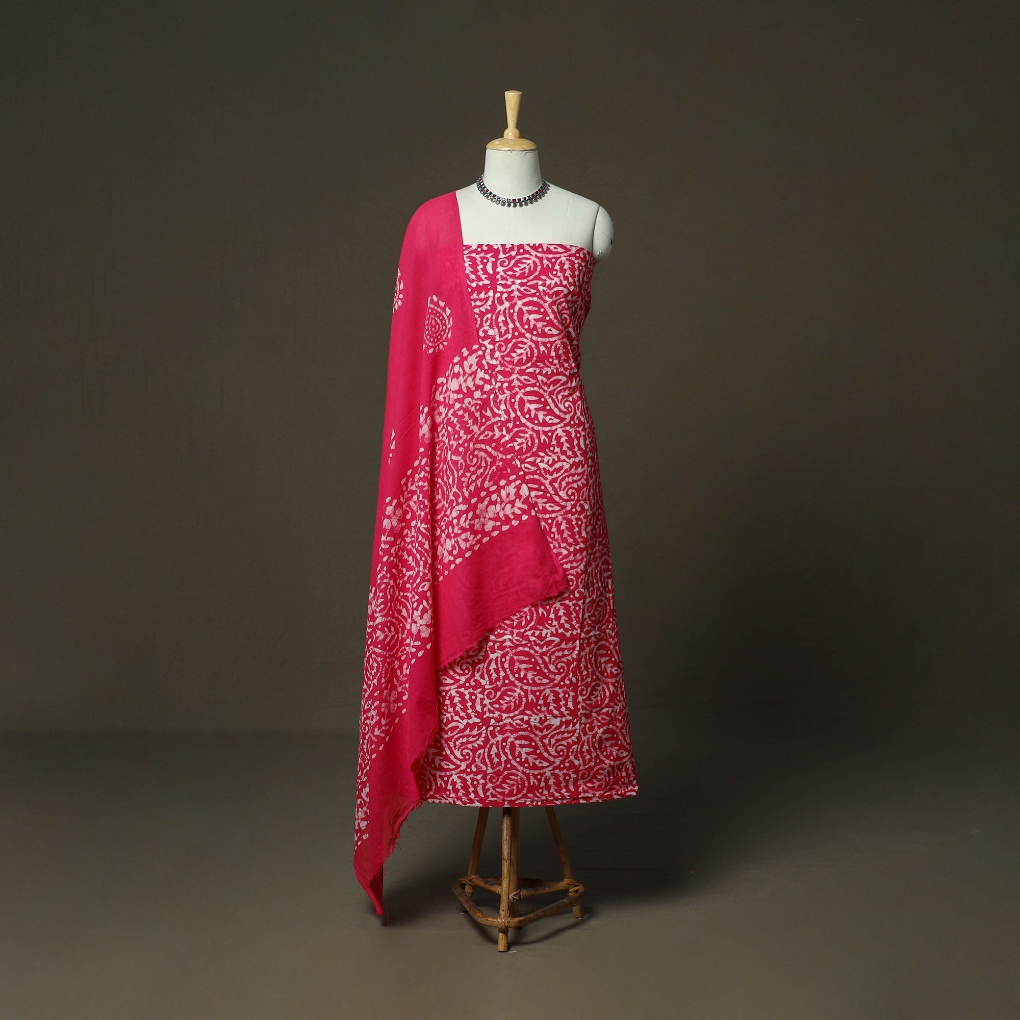 Pink hand block batik print cotton 3pc unstitched dress material from Madhya Pradesh is handcrafted by artisan Md. Wasim using the traditional wax-resist dyeing technique, a craft believed to be over 2,000 years old. The motifs beautifully reflect regional artistry that has been passed down through generations. The set includes kurta fabric, a coordinated bottom fabric and a matching dupatta, making it a comfortable and stylish choice for special occasions as well as graceful everyday wear.