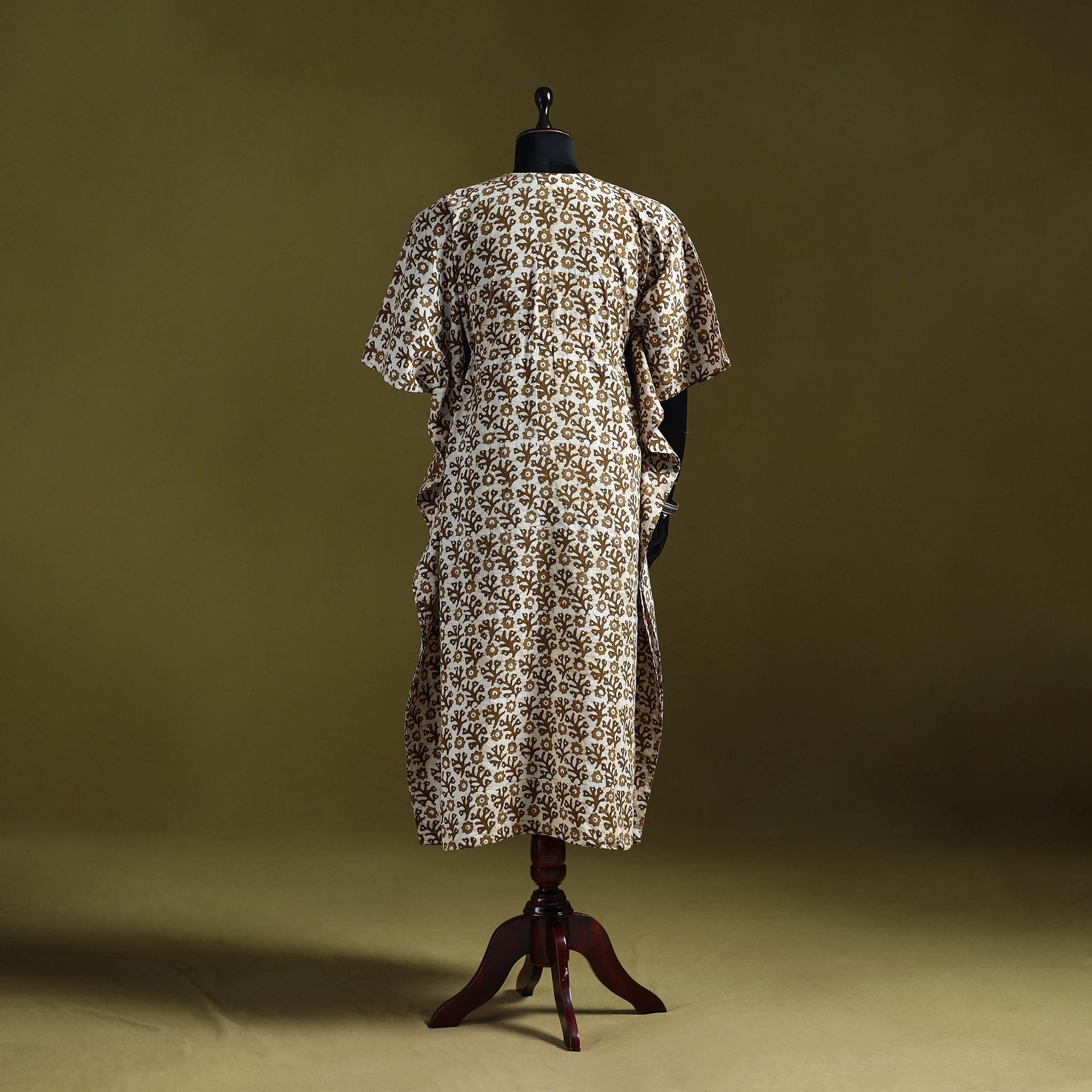 | Material | Brown hand block batik print long kaftan created using the traditional wax resist dyeing technique, estimated to be around 2,000 years old and known for its bold patterns and crackle effect. Made from breathable cotton, it features a drawstring waist for an adjustable fit. Perfect for lounging at home or casual outings. |