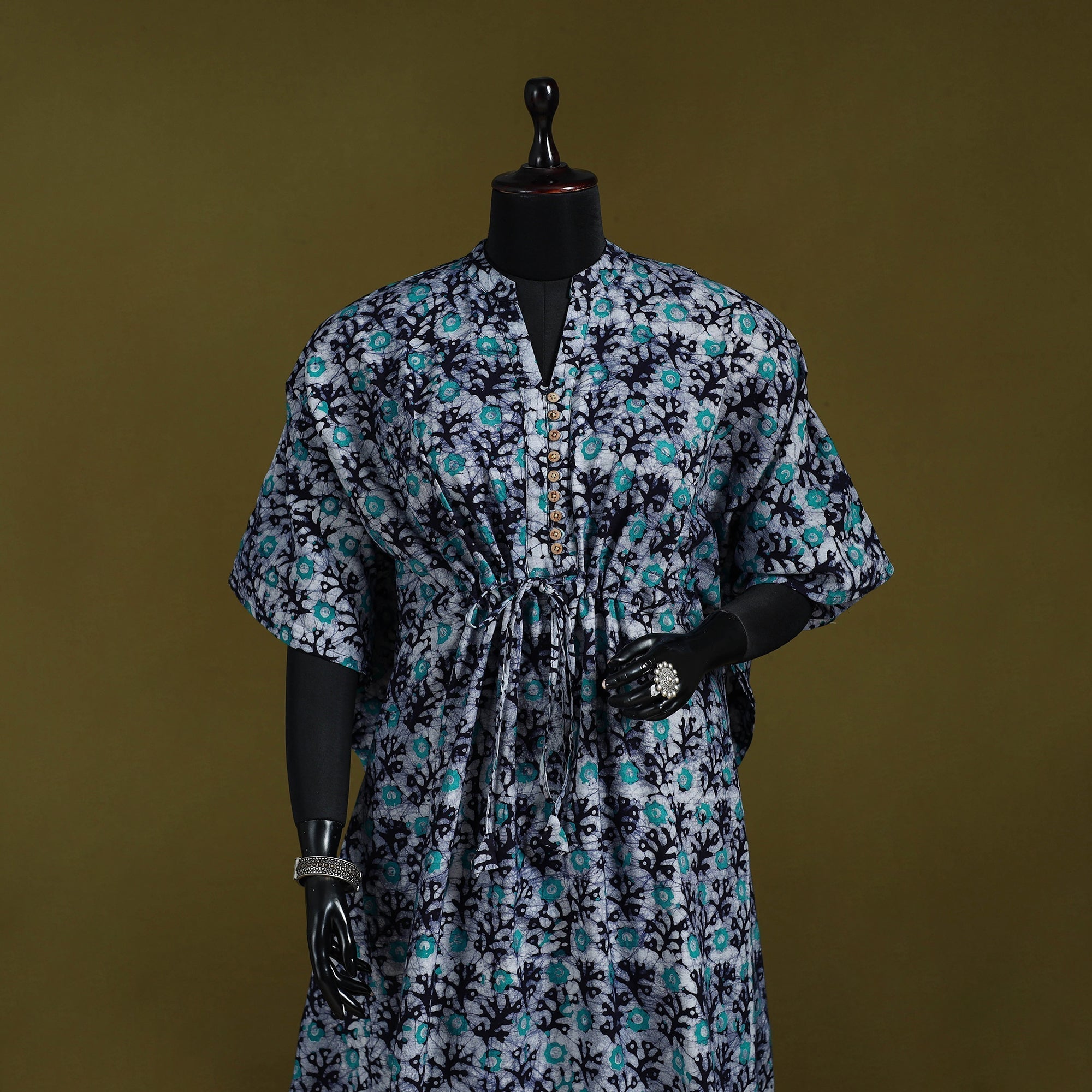 | Material | Blue hand block batik print cotton long kaftan created using the traditional wax-resist dyeing technique, a craft believed to be over 2,000 years old and known for its bold patterns and signature crackle effect. Made from breathable cotton, this kaftan features flowing sleeves and a drawstring waist tie that lets you adjust the fit to suit your shape. Perfect for relaxed lounging at home or easygoing casual outings. |