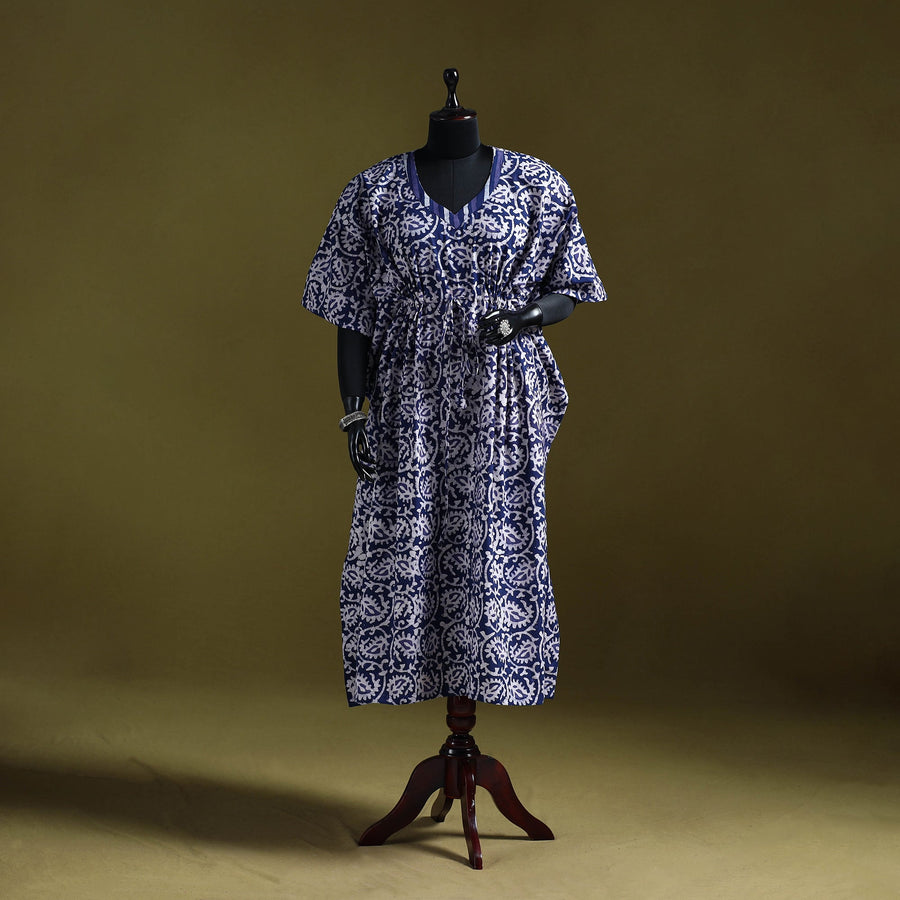 | Material | Blue hand block batik print long kaftan created using the traditional wax resist dyeing technique, estimated to be around 2,000 years old and known for its bold patterns and crackle effect. Made from breathable cotton, it features a drawstring waist for an adjustable fit. Perfect for lounging at home or casual outings. |