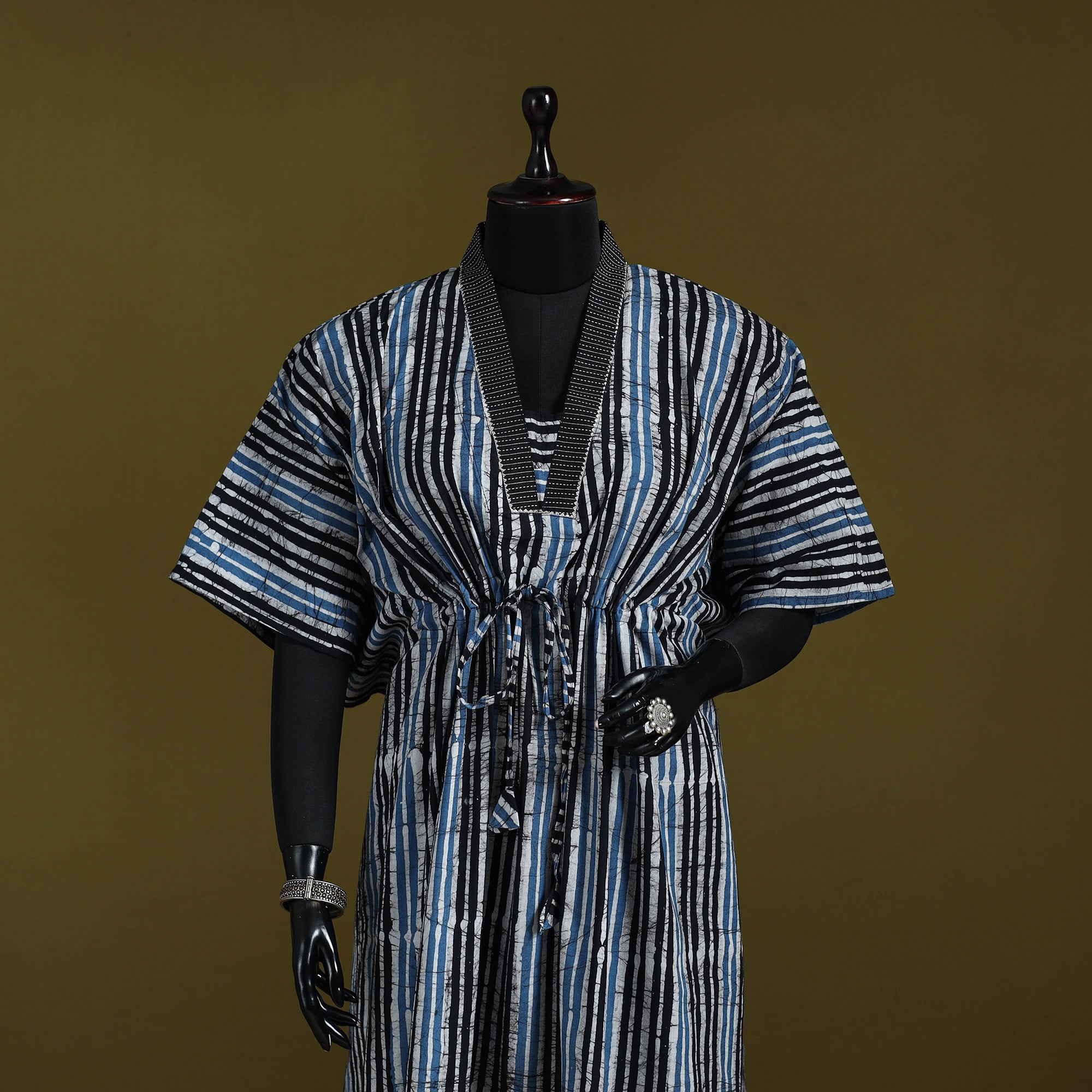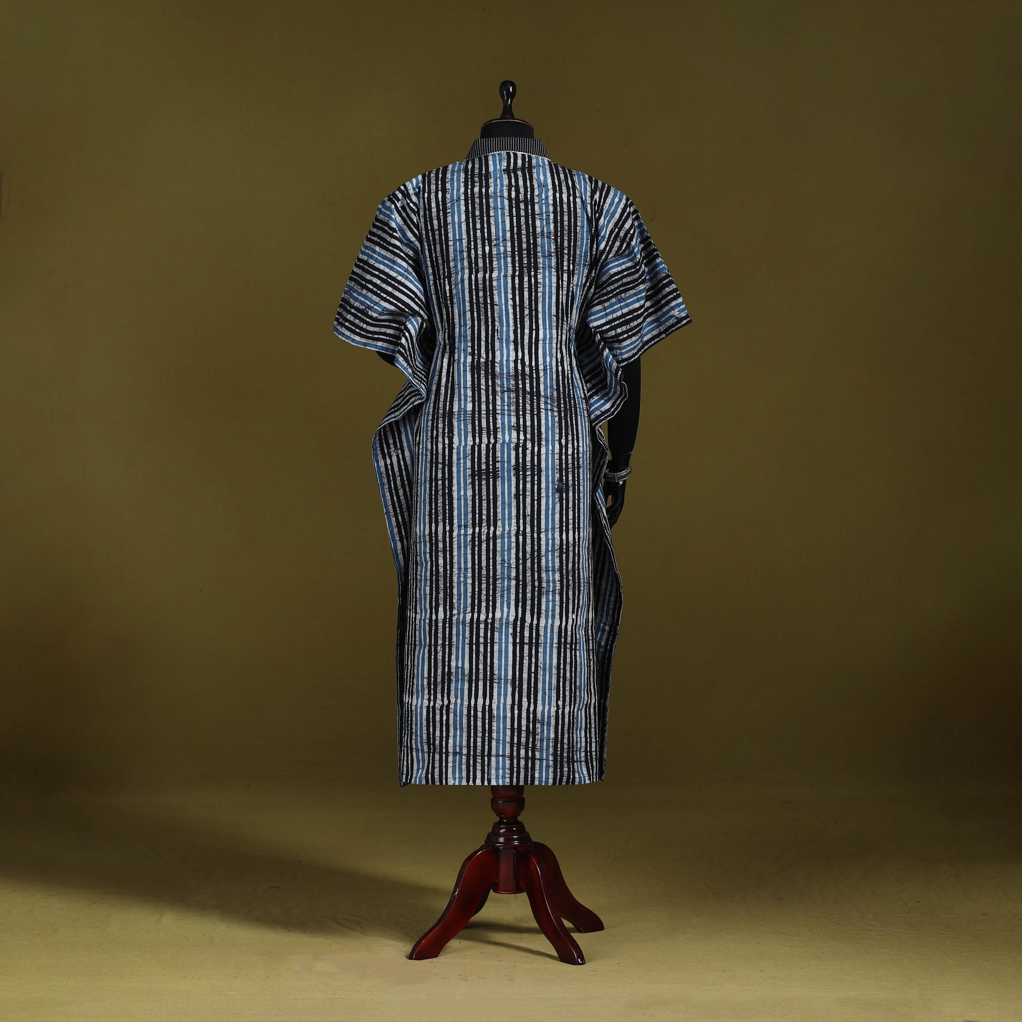 | Material | Blue hand block batik print cotton long kaftan created using the traditional wax-resist dyeing technique, a craft believed to be over 2,000 years old and known for its bold patterns and signature crackle effect. Made from breathable cotton, this kaftan features flowing sleeves and a drawstring waist tie that lets you adjust the fit to suit your shape. Perfect for relaxed lounging at home or easygoing casual outings. |