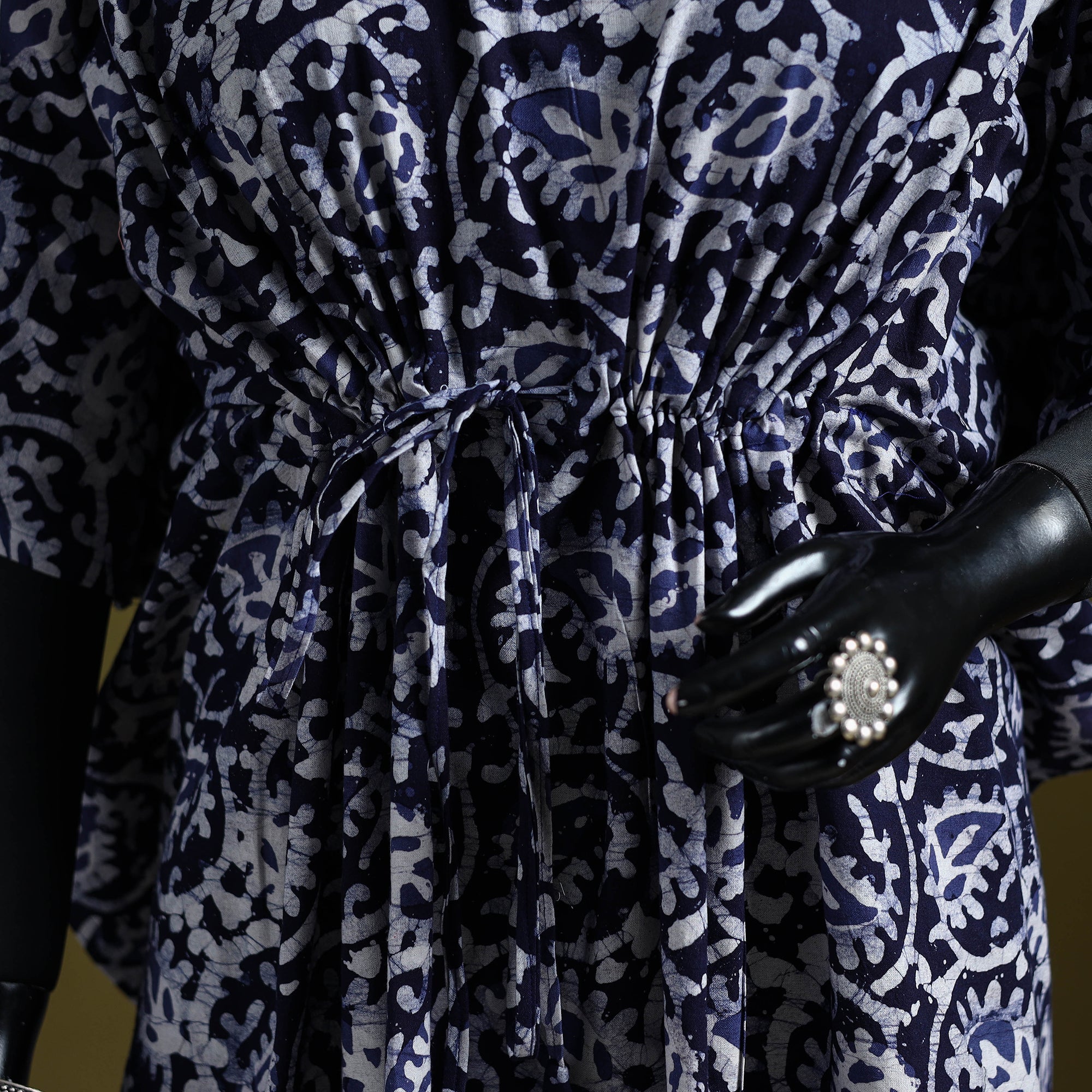 Blue hand block batik print medium kaftan created using the traditional wax resist dyeing technique, estimated to be around 2,000 years old and known for its bold patterns and crackle effect. Made from breathable cotton, it features a drawstring waist for an adjustable fit. Perfect for lounging at home or casual outings.