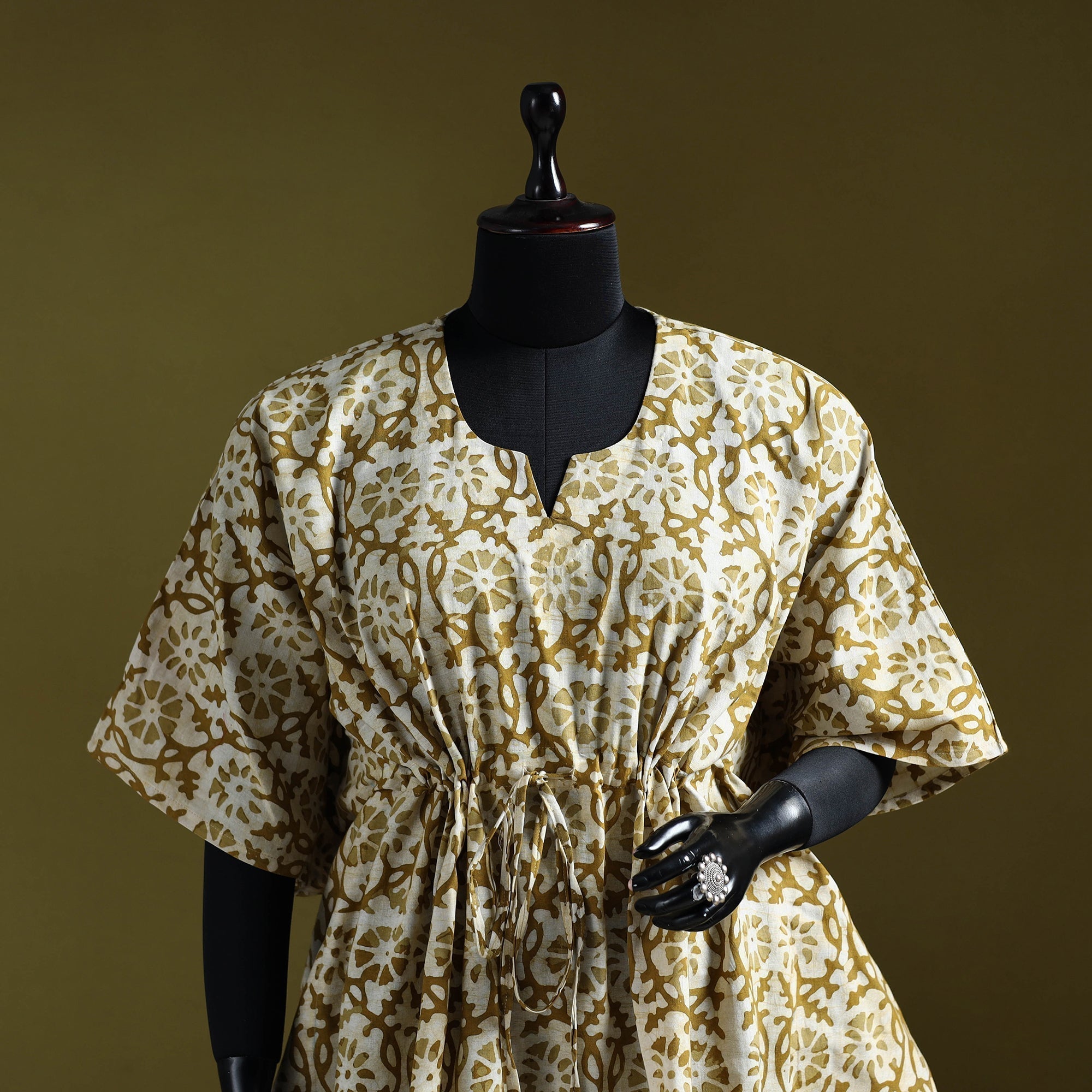 Beige hand block batik print medium kaftan created using the traditional wax resist dyeing technique, estimated to be around 2,000 years old and known for its bold patterns and crackle effect. Made from breathable cotton, it features a drawstring waist for an adjustable fit. Perfect for lounging at home or casual outings.