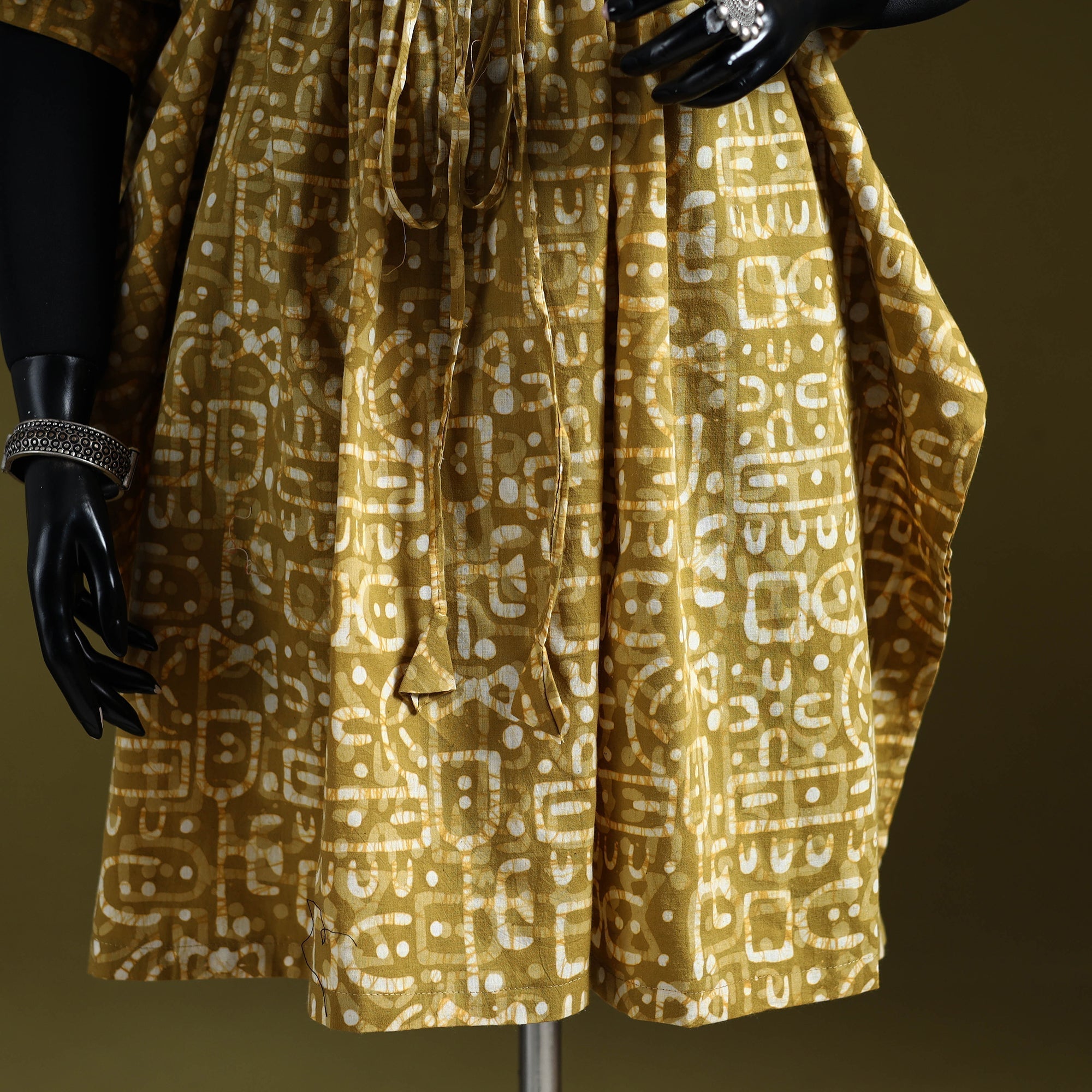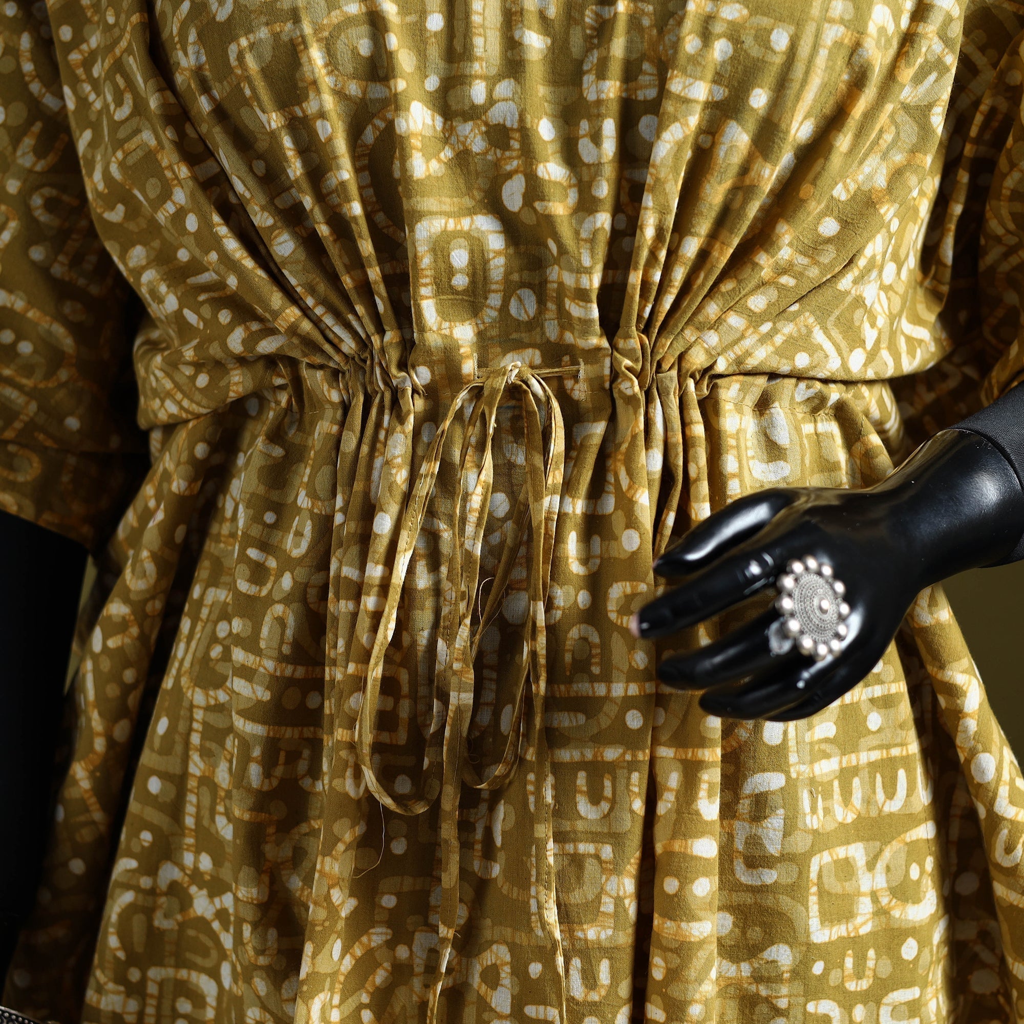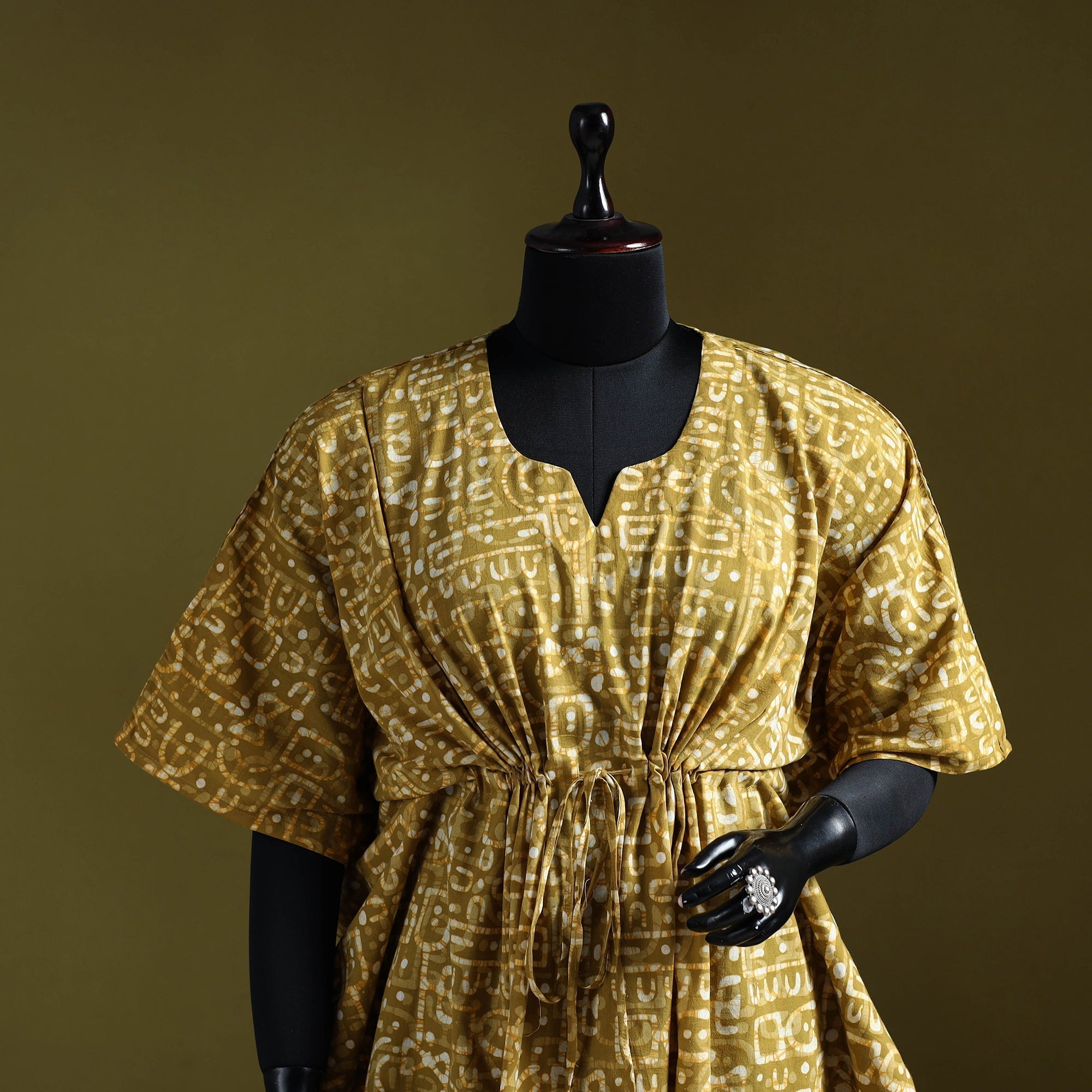 | Material | Yellow hand block batik print medium kaftan created using the traditional wax resist dyeing technique, estimated to be around 2,000 years old and known for its bold patterns and crackle effect. Made from breathable cotton, it features a drawstring waist for an adjustable fit. Perfect for lounging at home or casual outings. |