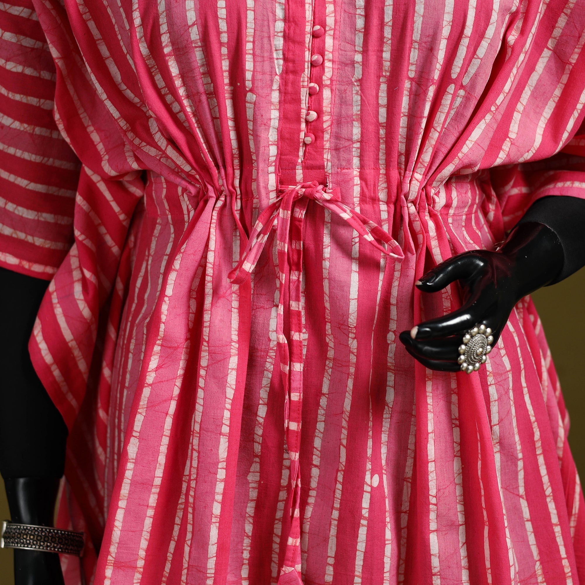 Pink hand block batik print medium kaftan created using the traditional wax resist dyeing technique known for bold patterns and crackle effect. Made from breathable cotton it features a drawstring waist for an adjustable fit. Perfect for lounging at home or stepping out for casual outings.