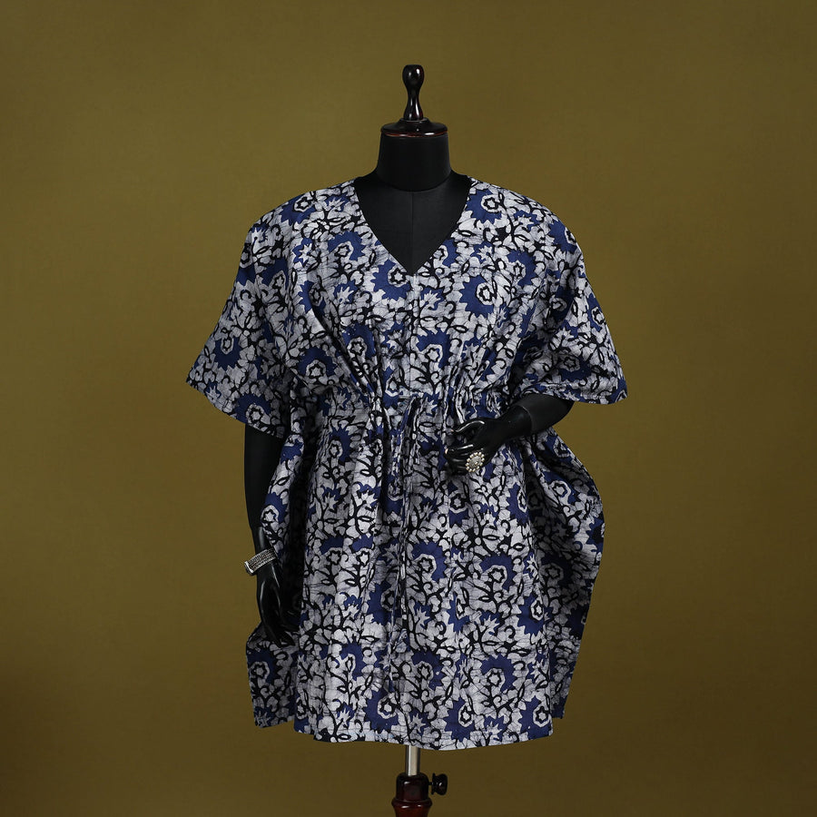 Hand block batik print medium kaftan created using the traditional wax resist dyeing technique known for bold patterns and crackle effect. Made from breathable cotton it features a drawstring waist for an adjustable fit. Perfect for lounging at home or stepping out for casual outings.