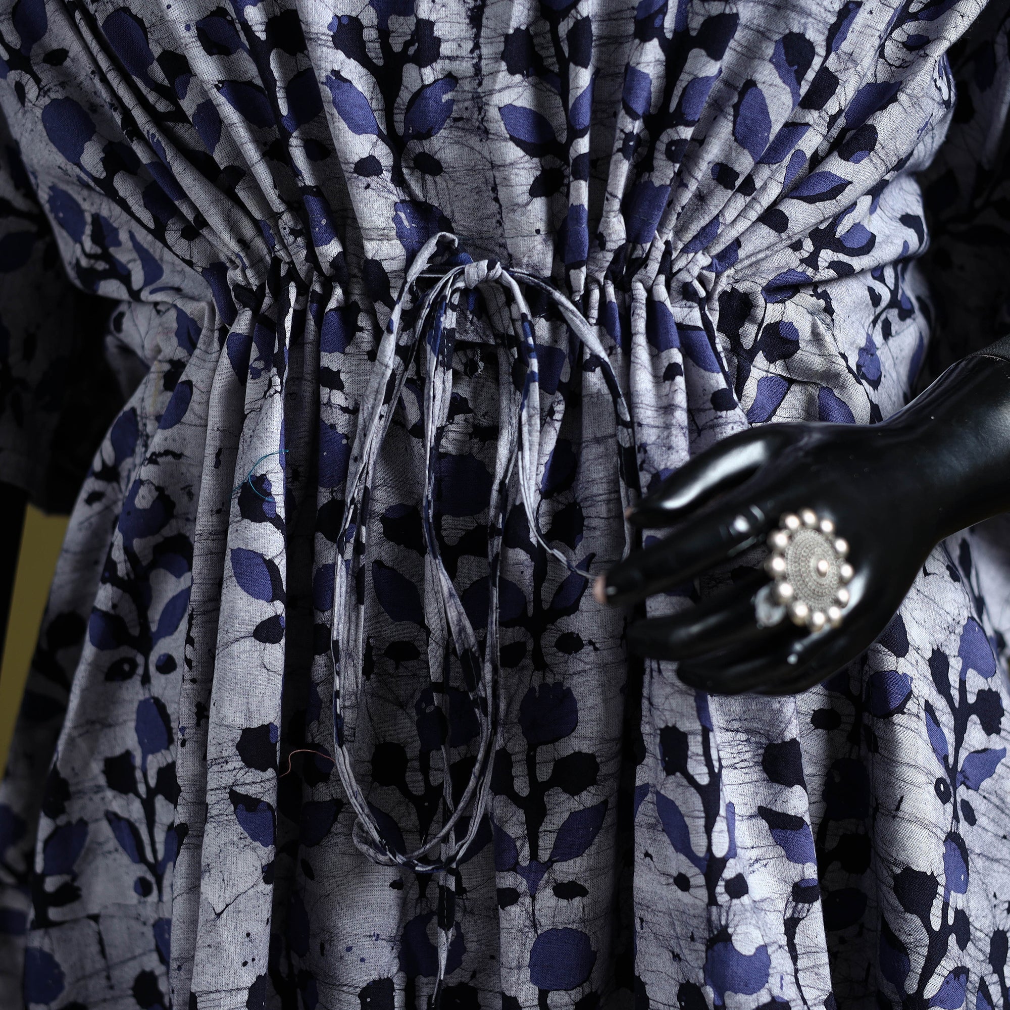 Blue hand block batik print medium kaftan created using the traditional wax resist dyeing technique, estimated to be around 2,000 years old and known for its bold patterns and crackle effect. Made from breathable cotton, it features a drawstring waist for an adjustable fit. Perfect for lounging at home or casual outings.