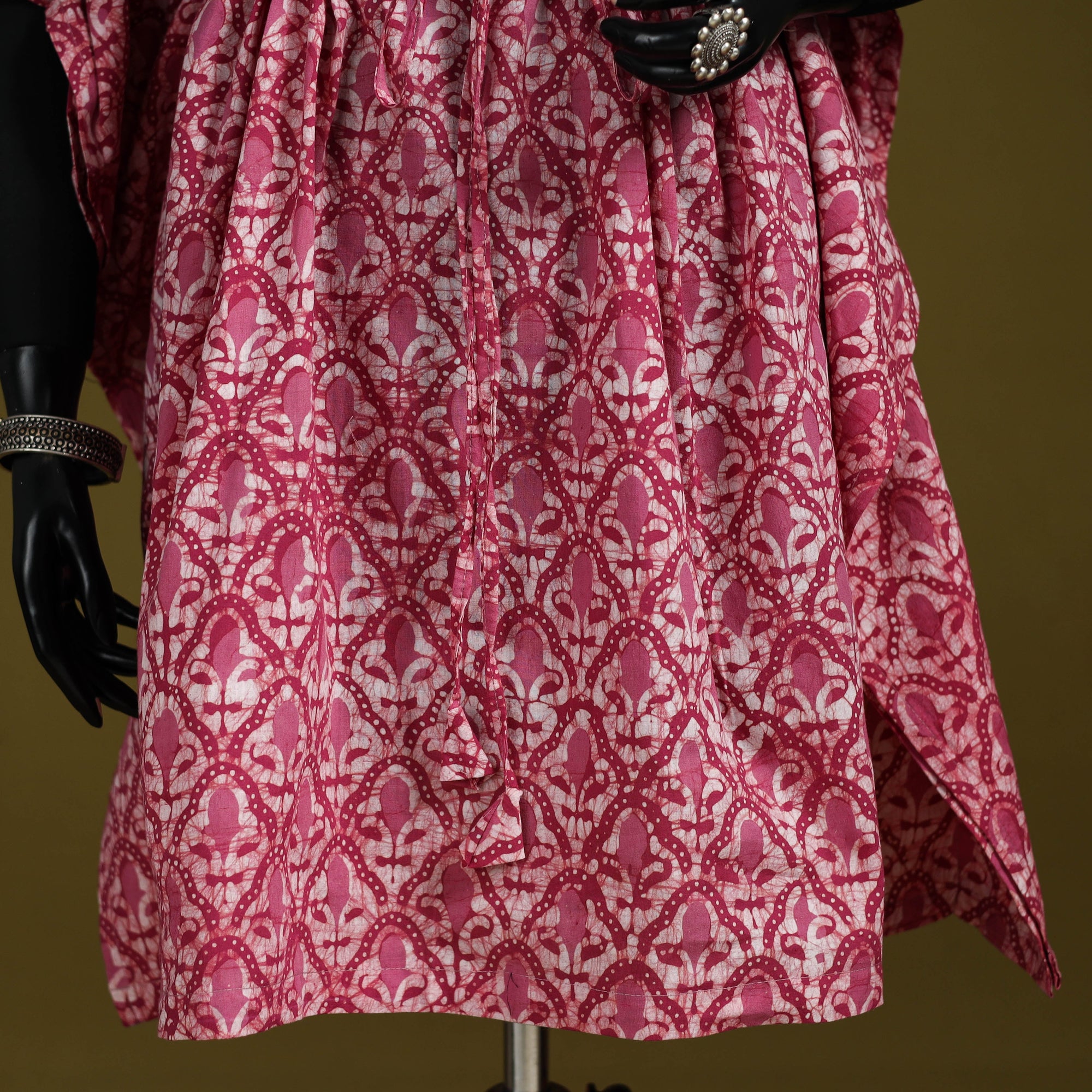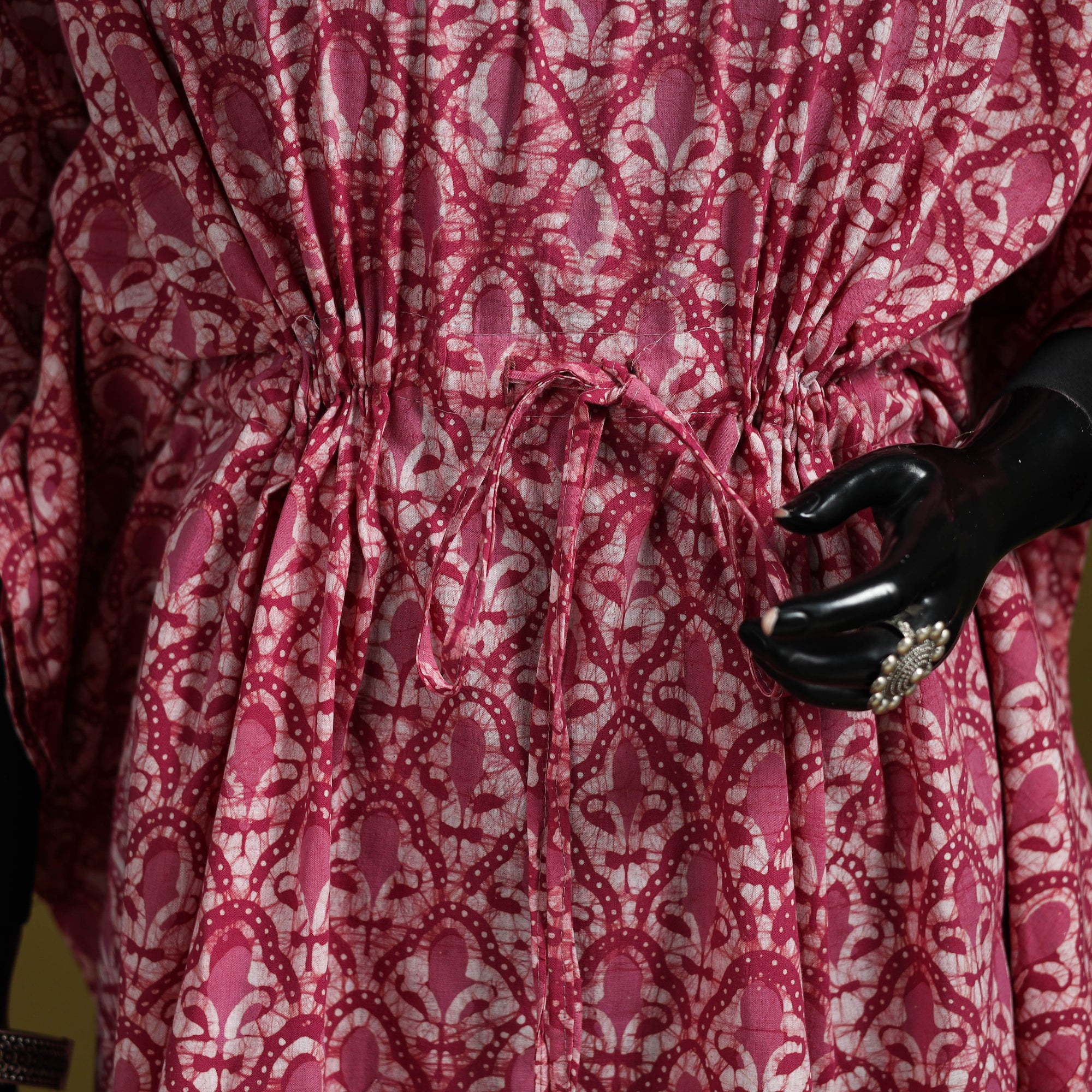 Pink hand block batik print medium kaftan created using the traditional wax resist dyeing technique known for bold patterns and crackle effect. Made from breathable cotton it features a drawstring waist for an adjustable fit. Perfect for lounging at home or stepping out for casual outings.