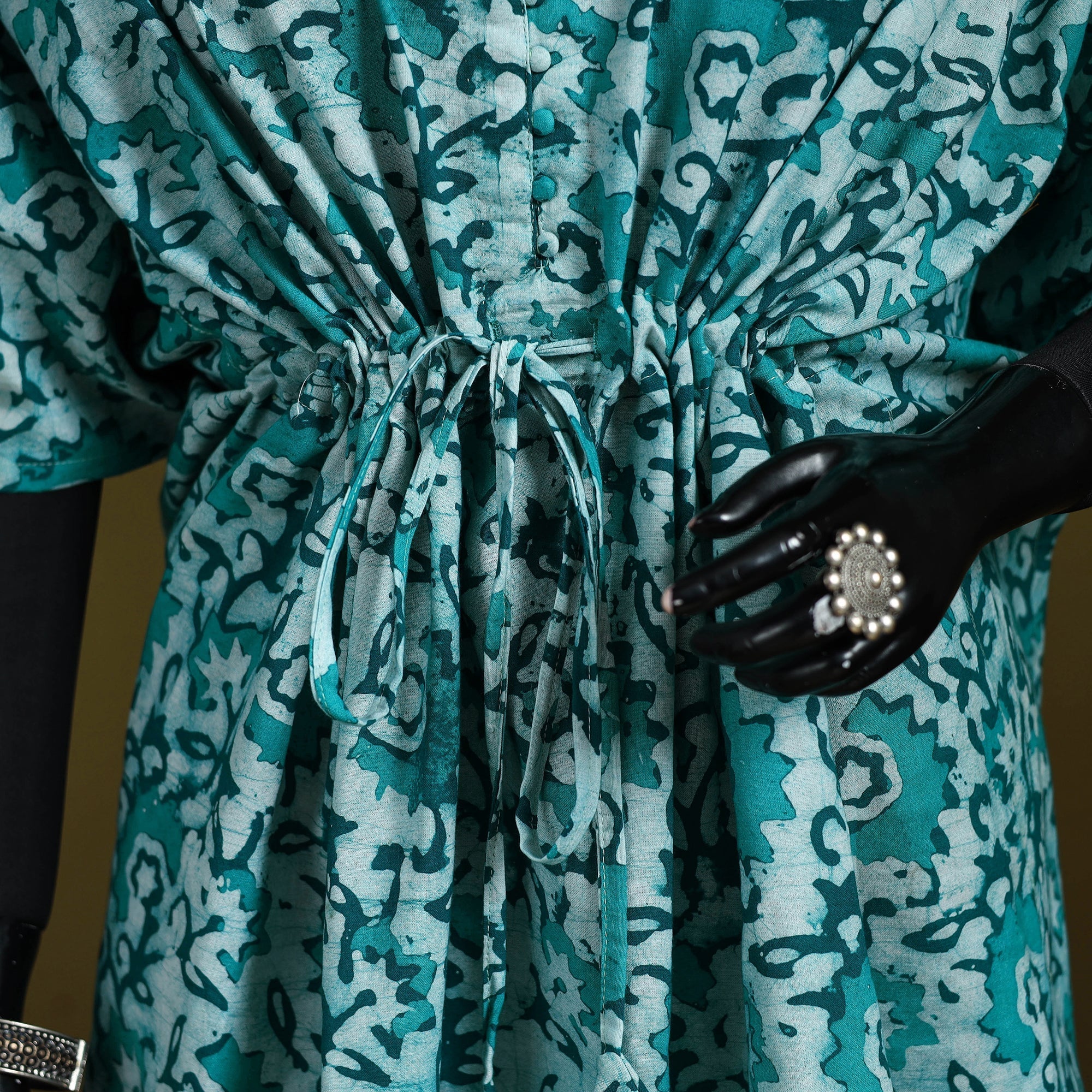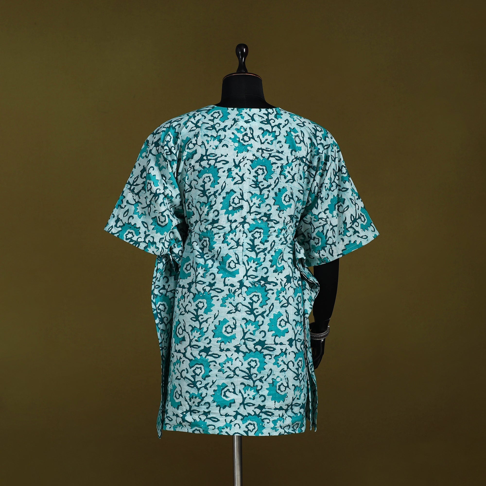 | Material | Green hand block batik print medium cotton kaftan created using the traditional wax-resist dyeing technique, a craft believed to be over 2,000 years old and known for its bold patterns and signature crackle effect. Made from breathable cotton, this kaftan features flowing sleeves and a drawstring waist tie that lets you adjust the fit to suit your shape. Perfect for relaxed lounging at home or easygoing casual outings. |